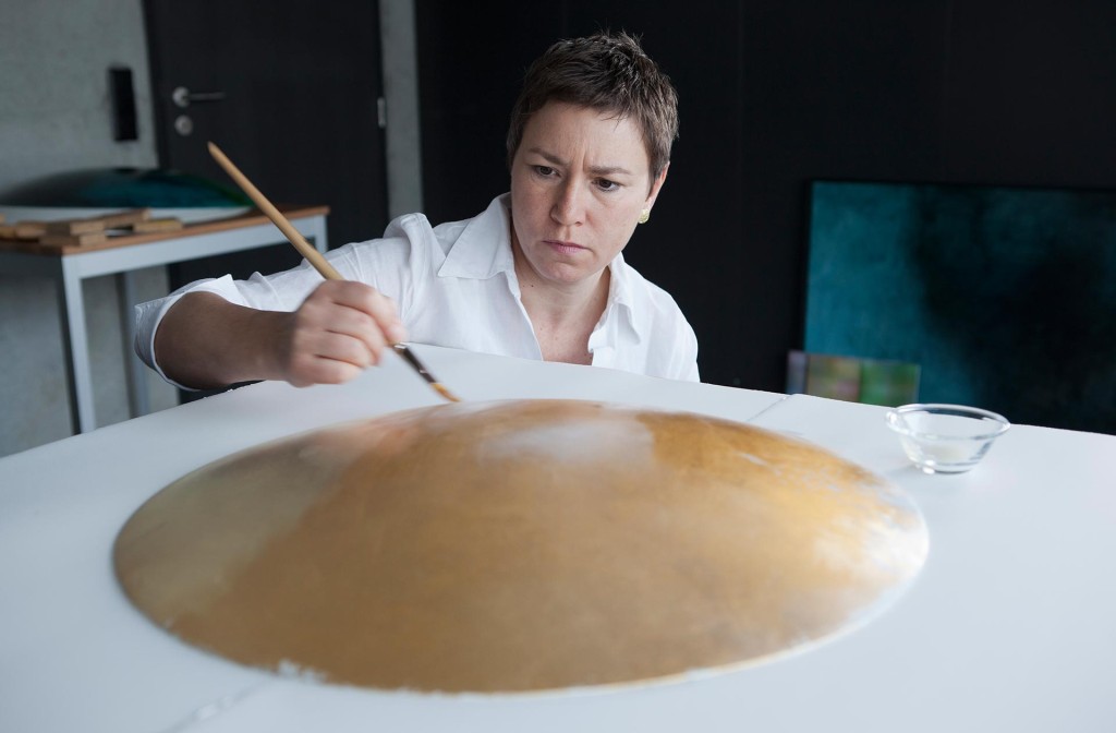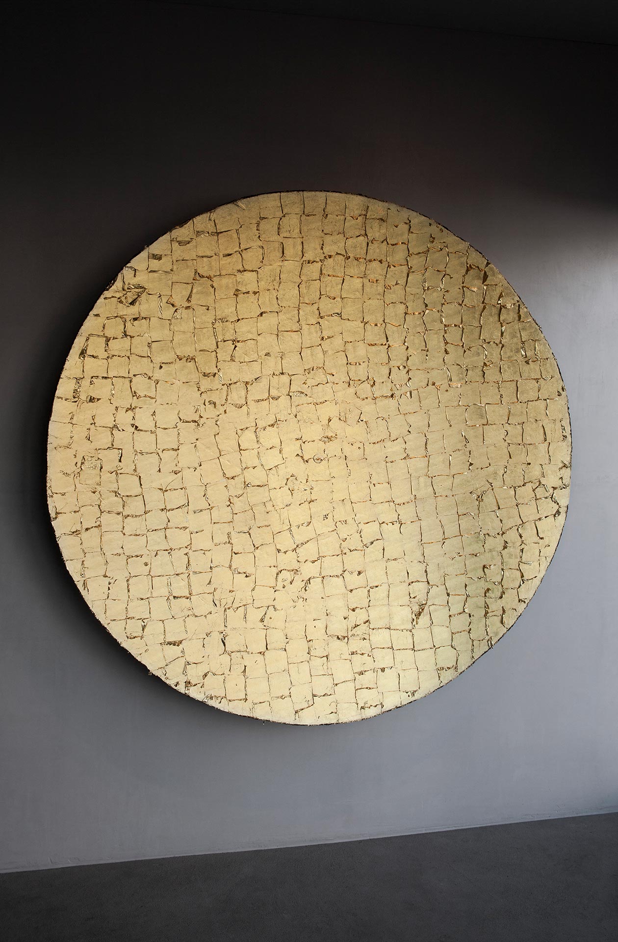 In her largest creation so far, Andrea Röthlin combined two metals that couldn’t be any more different: gold leaf and the clumsy, slightly convex bottom of a disused oil tank. Measuring almost 170 cm in diameter, it weighs no less than half a ton. Röthlin found it behind a stable in the Obwalden canton and had it transported by a crane to a gallery located on nearby Lake Sarnen.