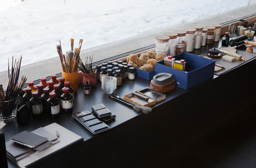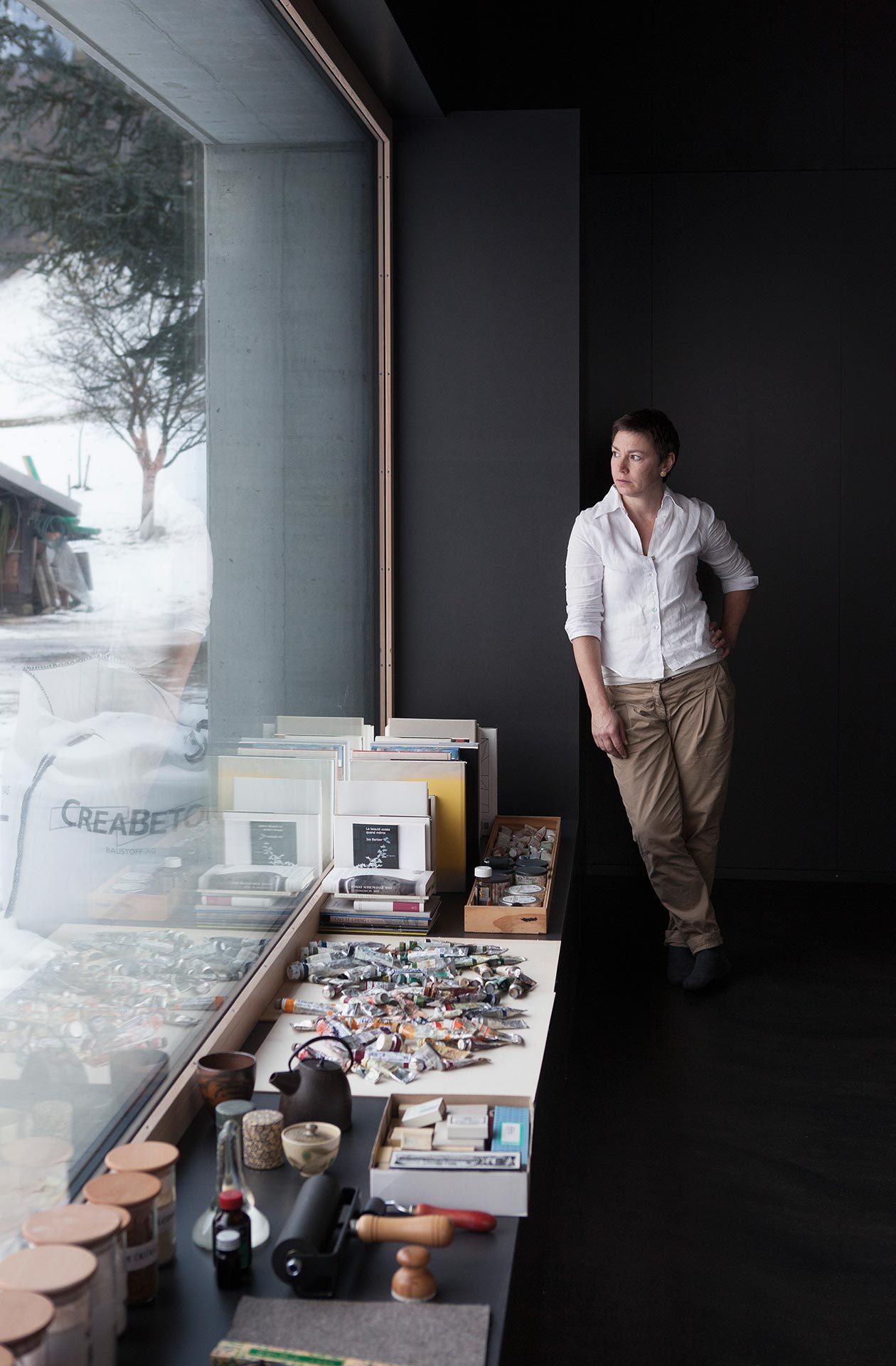 Andrea Röthlin’s atelier has been integrated in the new house. She is enthusiastic about the room, painted in a dark color and fitted with huge panorama windows – like a cave with a view of the vast scenery. In this atelier, applying gold on objects “in memory of my years in America” is an integral part of her art again: “Gold always casts a spell on me. Gold is exciting: bright and gleaming in the light, and gray and matte in the shade.”