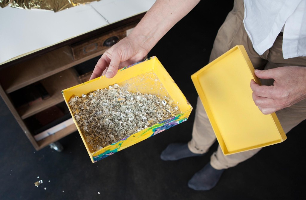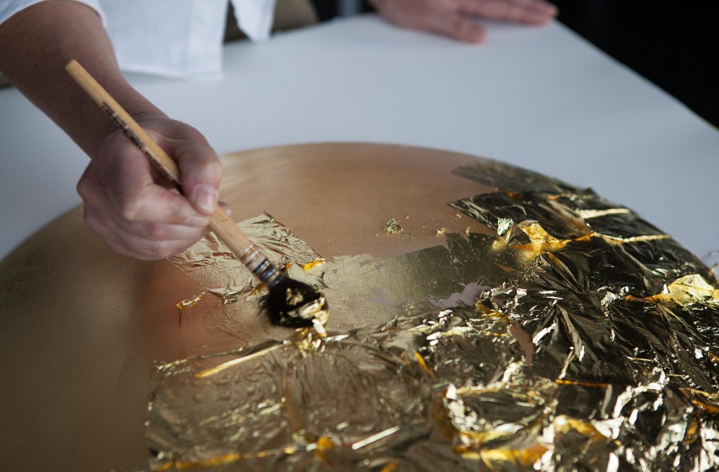 Röthlin carefully took the leaves of wafer-thin gold, measuring eight by eight centimeters, out of the package and placed them one after another on the steel bowl until it was covered completely. In contrast to what would have been customary, i.e. leveling out protruding bits of gold foil or those that extend beyond the object’s edges so as to create an evenly gilt surface, she deliberately left them as they were, thus making for a charming effect: the protruding “surplus” is set in motion by the slightest draft in the room and starts glittering and dancing in dreamlike splendor. “For me, it looks as if golden lava erupted from the Sachseln Mountains and has created a mountain lake whose surface is rippling in a warm breeze,” the eulogist said when he opened the exhibition in 2012.