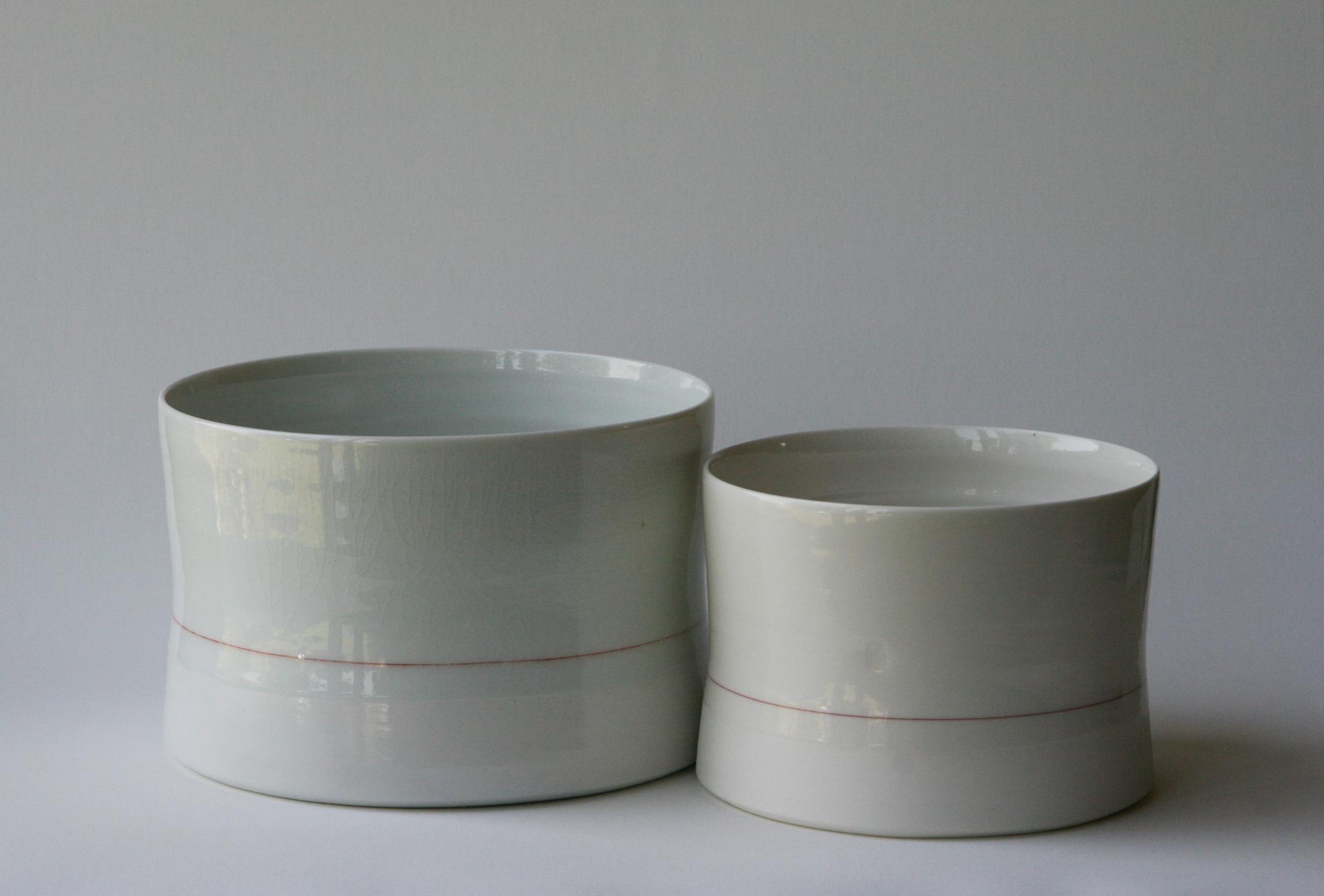 Vessels, porcelain, engobe lines, feldspathic glaze, burnt in wood fire. Photo Hanno Leischke.