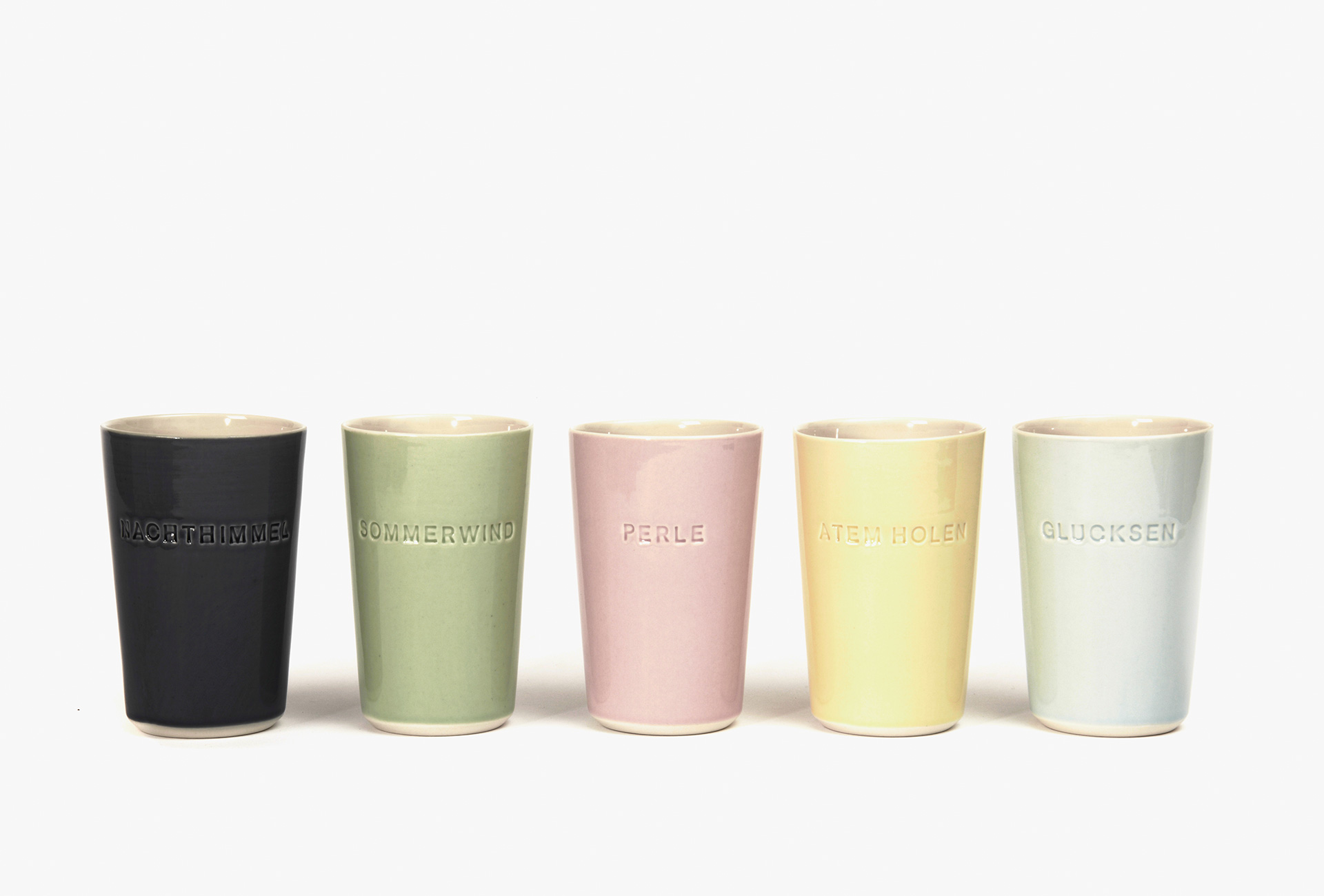 Schriftbecher ( poetic word-cups ). Porcelain, stamped by hand, H 12 cm. Photo Martin Beck.