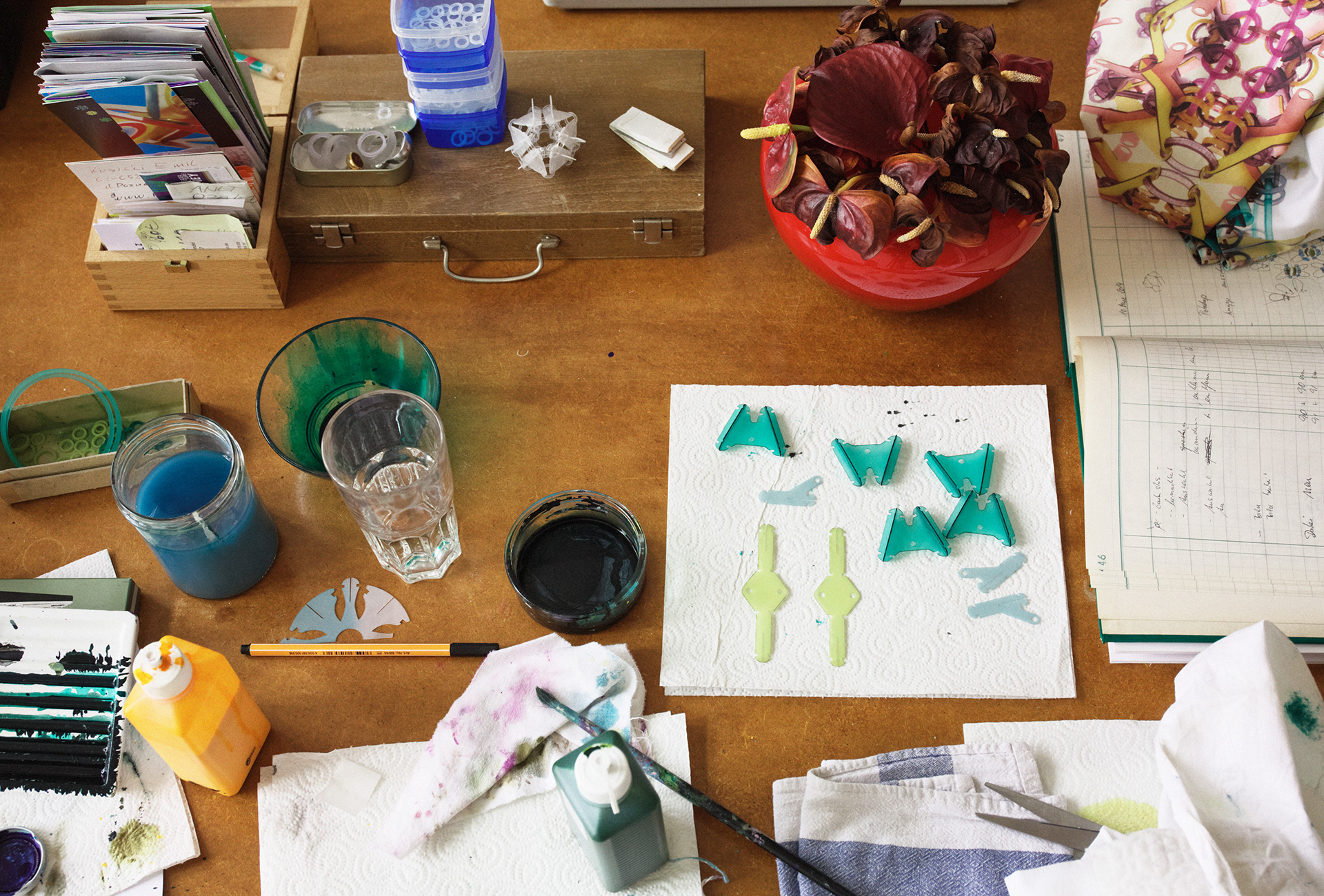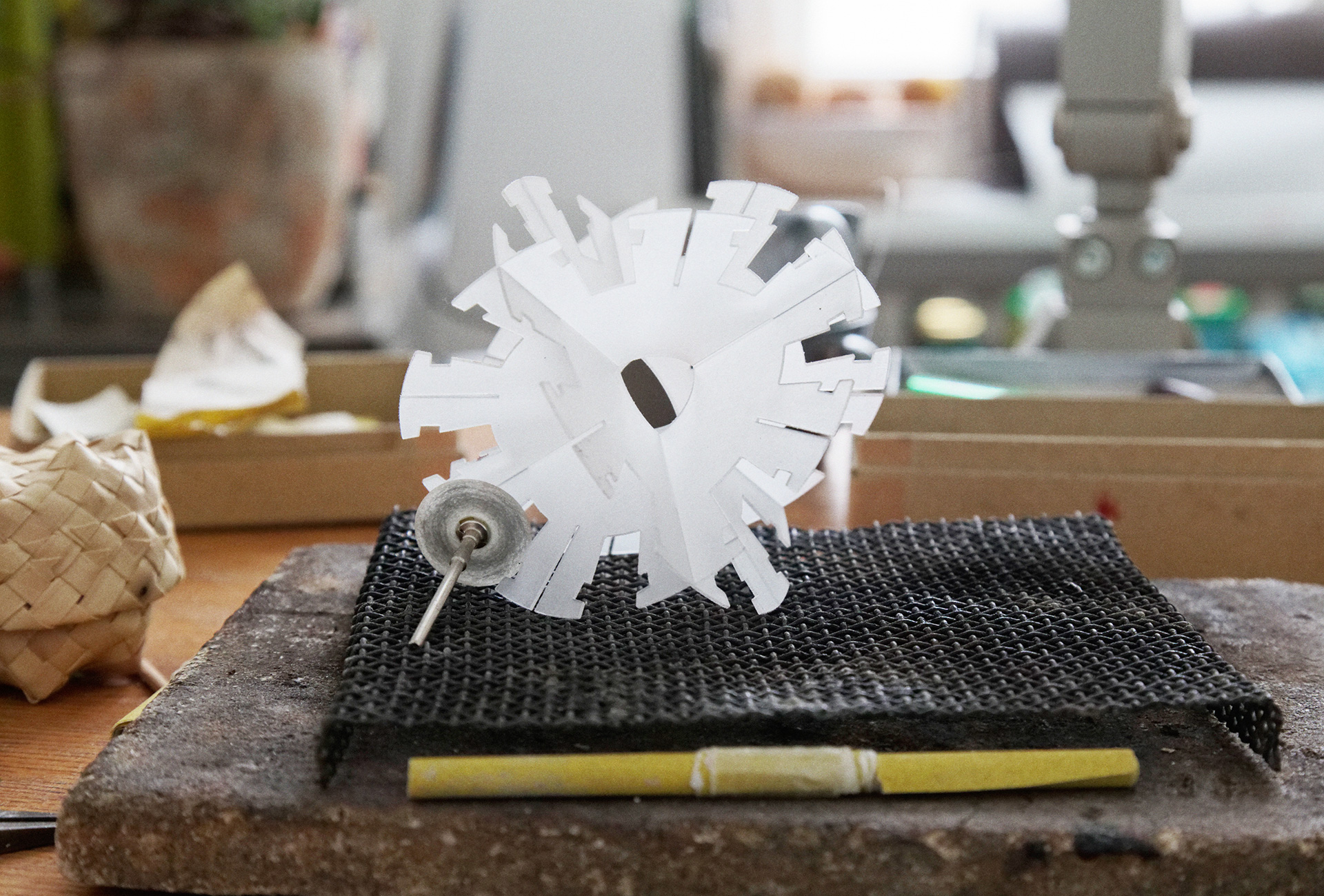 Svenja John My work always starts with inspiration. I’m inspired by nature, by technology, by anything. The design phase comes next, involving the drawing of sketches and creating paper models. But I also develop designs using CAD. In the actual crafting process, I cut the individual elements using a water jet cutter, but rework them by hand. I also paint and assemble them manually. You can watch a video on youtube* that shows the work process.