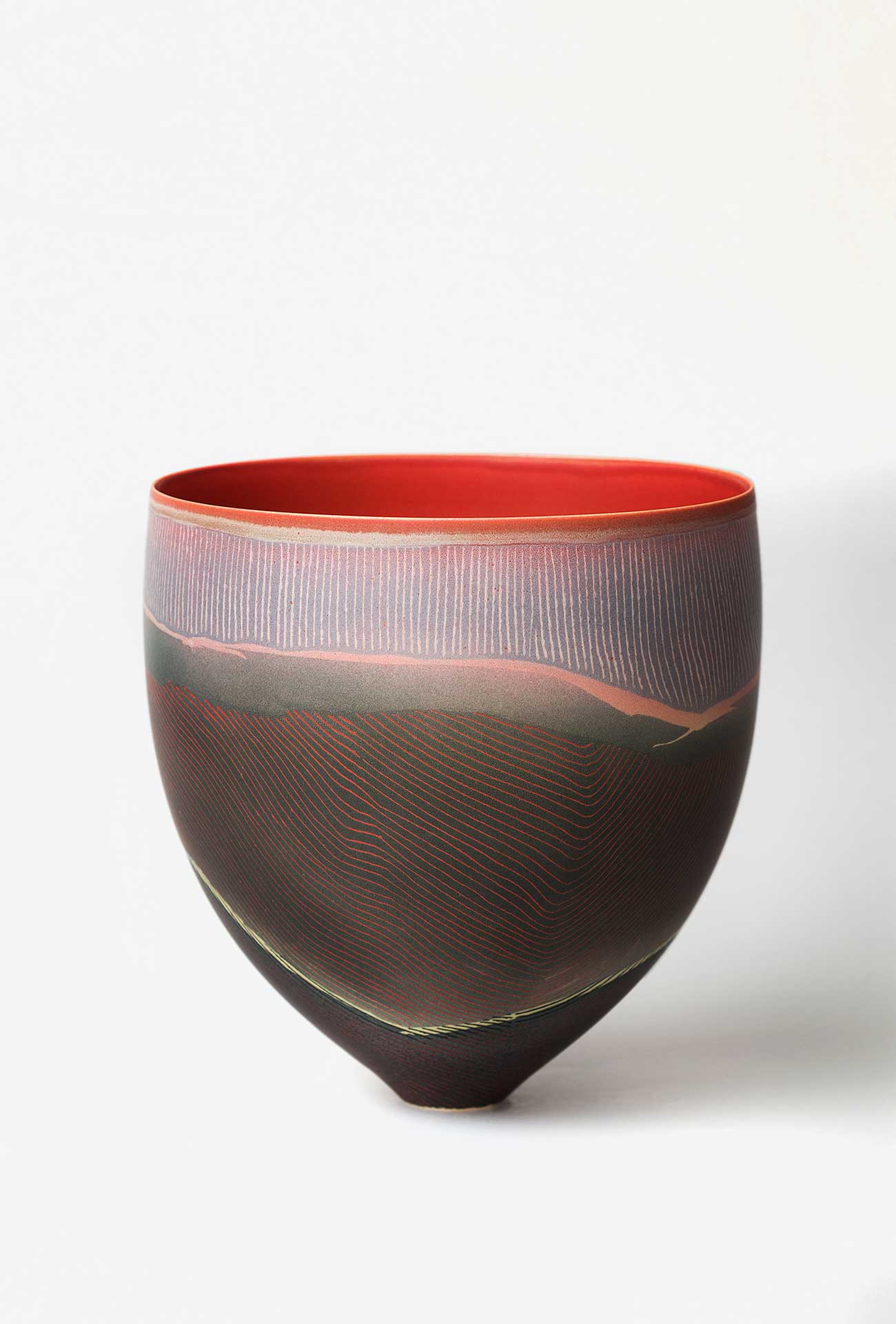 Pippin Drysdale’s austere, tall, perfectly wheel-turned porcelain shapes rise from minimal bases and shimmer with intense colors. She sprays multiple layers of glazes to create a velvety matte shimmer. Lush yellow, orange and red tones are shot through with slender dark lines. Like memories transformed into revolving images, the seemingly weightless vessels suggest the warmth, the spaciousness and even the seasons of the year in the barren, sun-drenched landscapes of Australia.