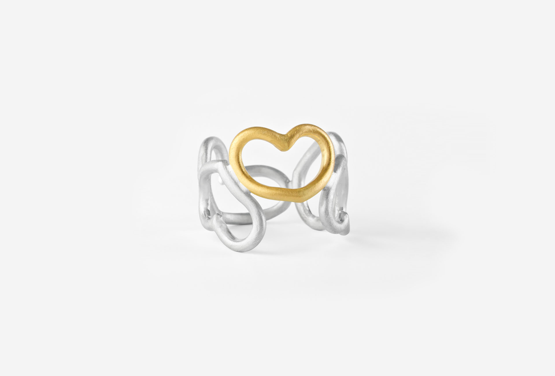 The surface is the theme for Artemis Zafrana. The interplay between wrought surfaces and surfaces processed to a velvety softness enlivens the large, simple and clear forms of her pieces of jewelry.“ In the sculptures, I go so far that the surface disappears,” says this artist, who was born in Istanbul and grew up in Greece. A strip “retracing” the contours gives her sculptures a light, buoyant and graceful look.