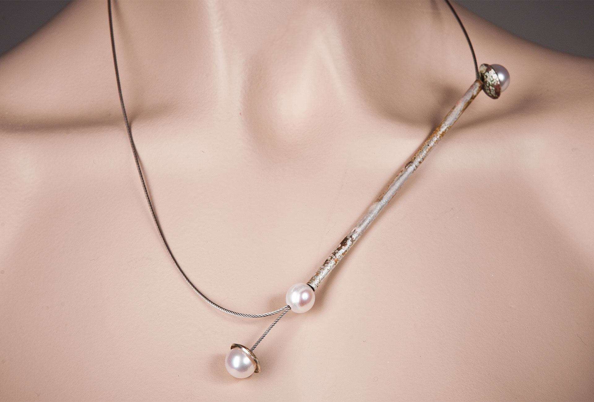 Necklace, silver patinated, freshwater pearls, stainless steel rope