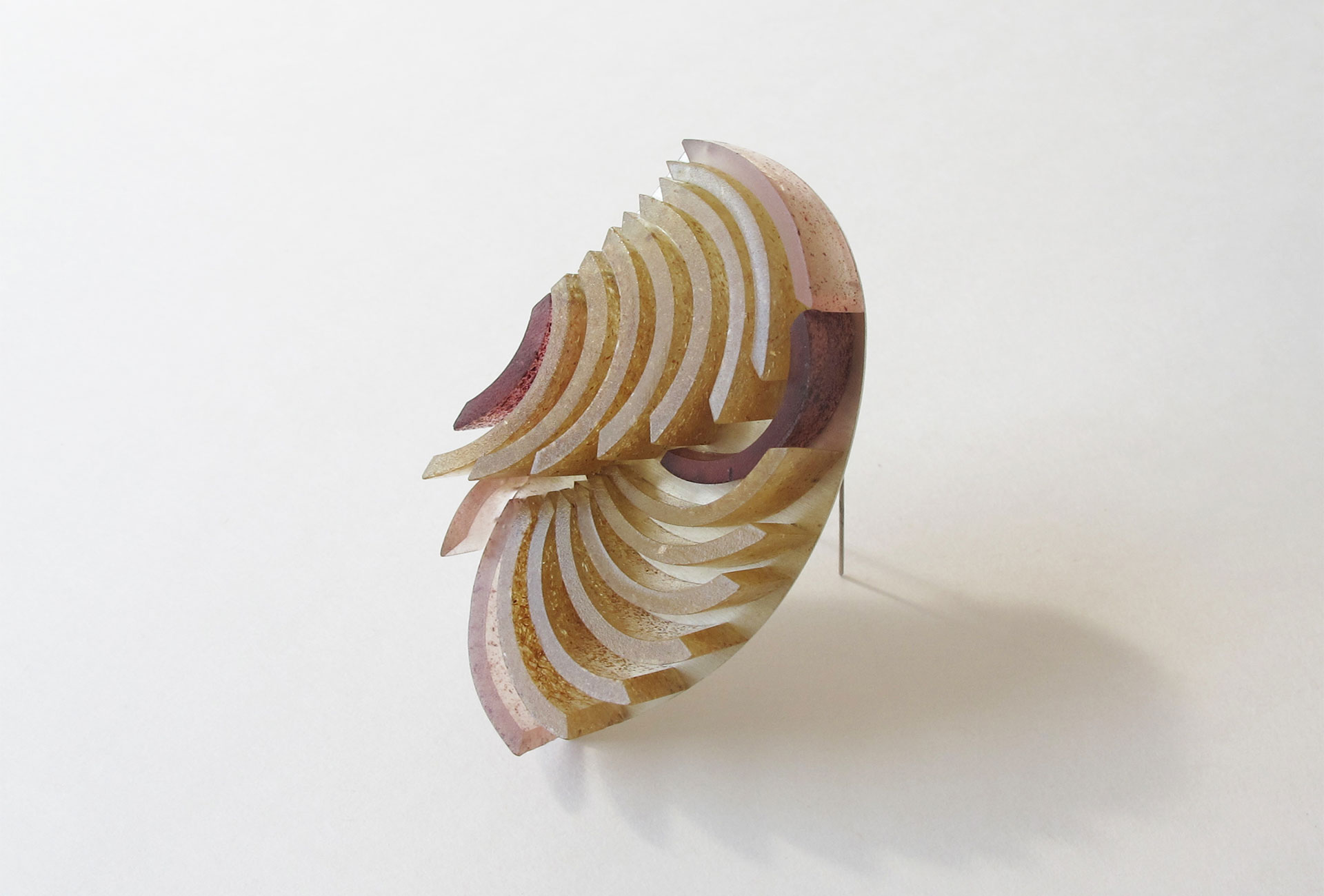 Nature, and the creative use of materials is also at the root of Yoshie Enda’s work. “Flowers bloom gloriously for a brief moment and eventually wither. This is how nature works, but I feel pity for the transient beauty of flowers”, admits Enda. Attempting to prolong the life of the flower, she “performs a memorial” whereby she grinds dried flowers and herbs and mixes it with resin. During the process, Enda adds natural dye colors for a light to dark gradient effect that has become a hallmark of her work. Through the Reflora body of work, Enda, whose jewelry appeared in the music video for Lady Gaga’s Born This way (2011), has extensively researched flowers, settling on 6 types of plants that keep their natural color when mixed with resin. “I wish for my jewelry to travel through time and place and bloom once more.” Enda’s romantic ideas and delicate materials are in stark contrast to the geometric forms of her brooches and necklaces. With Reflora the artist who has been born in Saitama, Japan, where she currently resides, offers us a 21st century take on memento mori – the mortality of all living things.