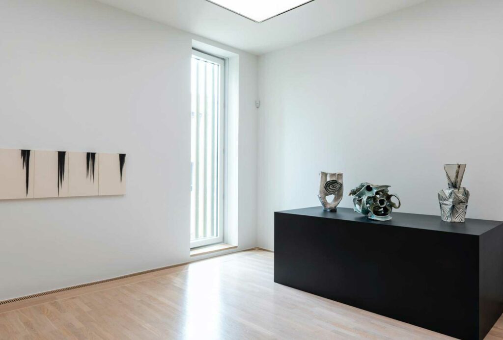 Fragment of an Infinite Discourse exhibition at the Lenbachhaus in Munich. Ceramics by Johannes Nagel in dialogue with a series of works by Mario García Torres. Photo: Simone Gänsheimer, Lenbachhaus.