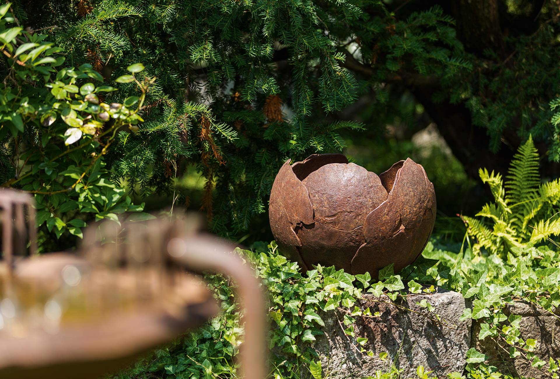 Spherical iron object made of several parts in the garden of the metalsmith and artist in Munich, where nature is allowed to unfold. Photo Eva Jünger.