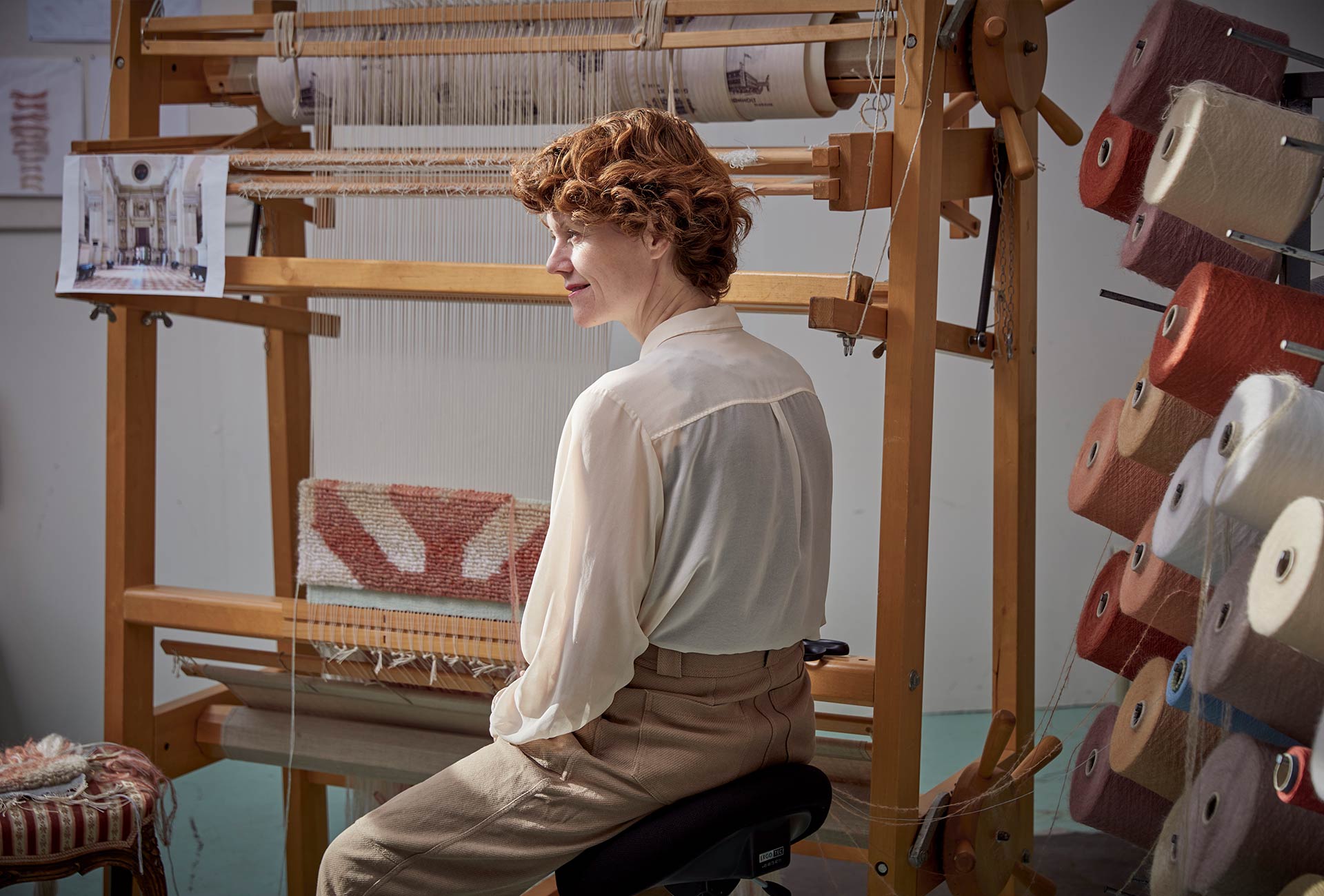 The Danish textile artist Signe Emdal. On her loom is “Palladio,” which she created for the 2022 Homo Faber exhibition Crafting a More Human Future in Venice. Photo: Kristine Fuch.