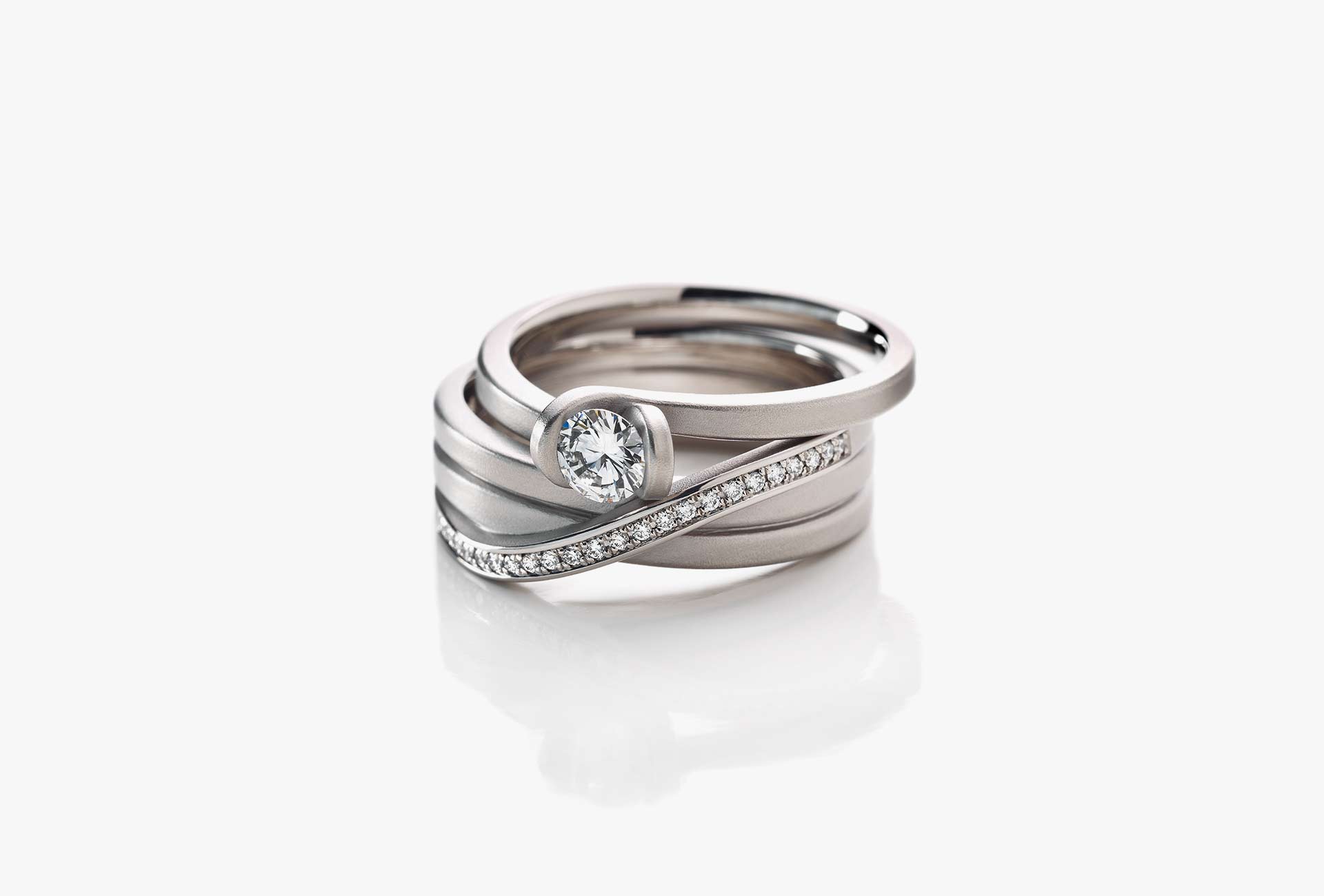 Oliver Schmidt, combination solitaire diamond ring and ring Endloses Band [Endless Band], platinum. Oliver Schmidt from Pforzheim earned an international reputation by reshaping geometric profiles such as knots, waves and curved lines, which he masterfully crafts in gold or steel. www.ol-schmidt.de