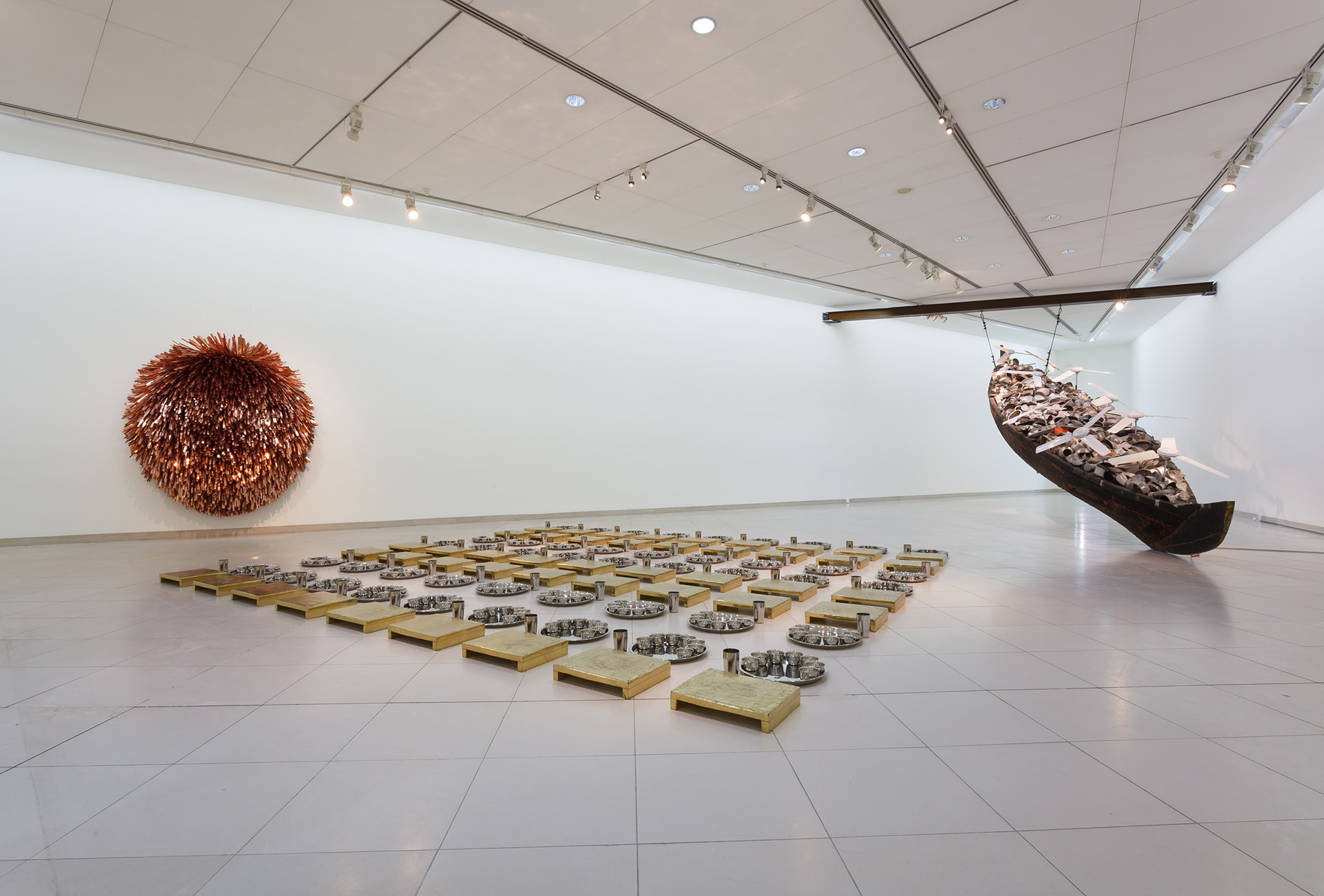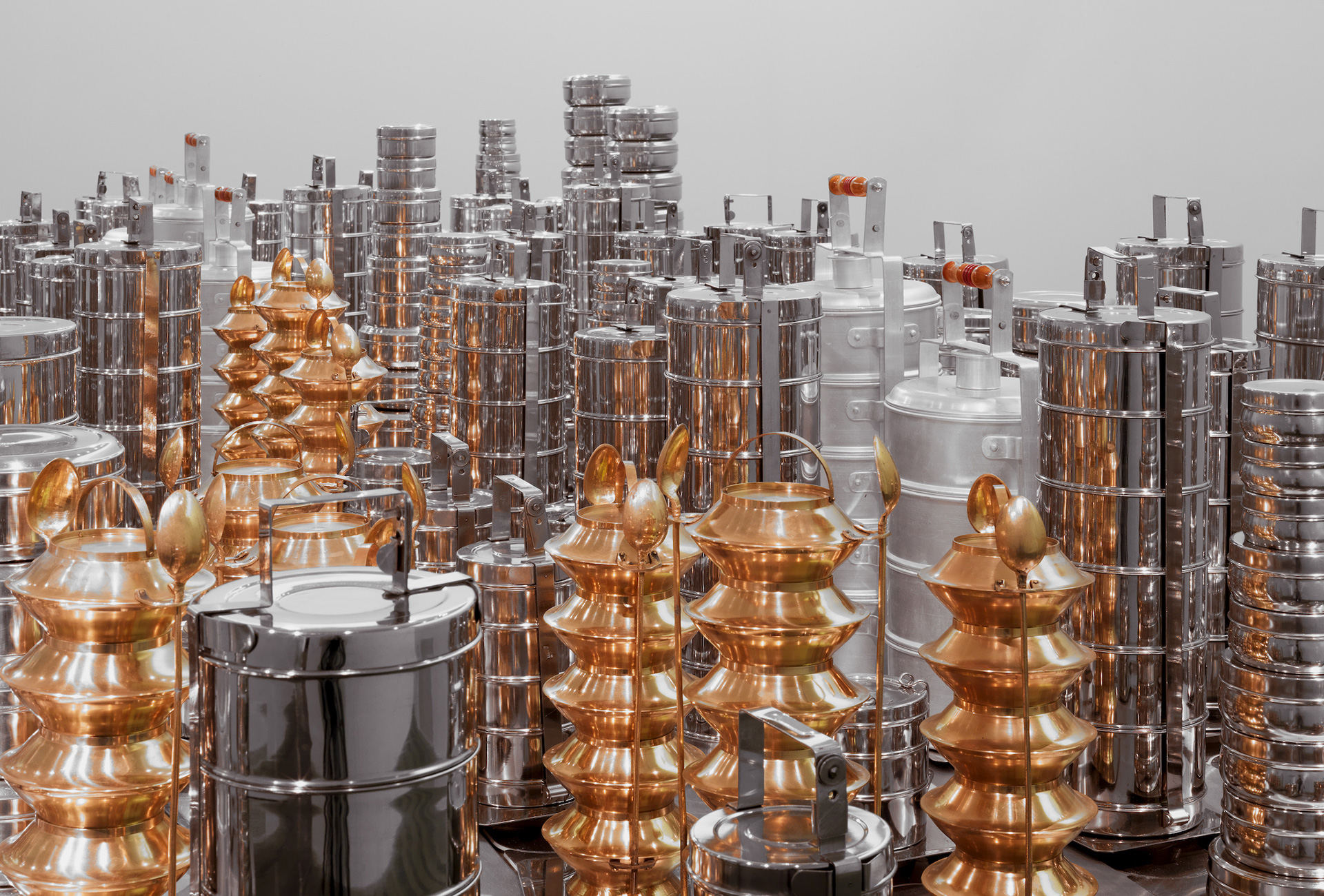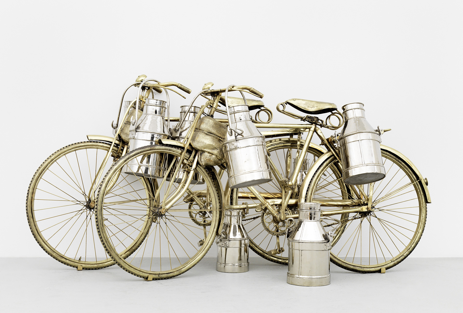 Die Ausstellung Everything Is Inside von Subodh Gupta ist inspiriert vom Alltag seines Heimatlandes. Der indische Künstler portraitiert eine Gesellschaft, die sich durch den wirtschaftlichen Aufschwung der letzten Jahrzehnte rasant wandelt. Die Entwicklung kontrastiert mit traditionellen Werten, der Spiritualität und Religion der Bevölkerung. Die entstehende Spannung nutzt Gupta für seine Skulpturen, Gemälde, Videos und performativen Arbeiten. Unmengen von Blechwaren häufen sich auf dem Boden in der zentralen Halle des MMK. Hier und da ragen Wasserhähne aus dem Berg abgenutzten, einfachen Geschirrs. Sie bewässern das Objekt This is not a fountain (2011–2013). Die Einzelteile der Installation, die auf ein Gemälde von Matisse anspielt, hat der Künstler über Jahre hinweg gesammelt. Unweit schmiegen sich zwei goldfarben angemalte Fahrräder mit mehreren Milchkanistern aneinan- der. Der Titel Two Cows (2003–2008) beschreibt eine mögliche Assoziation. Die Frage ist, ob sich der aufgehäufte Überfluss an scheinbar banalen Einzelteilen auch als Konsumkritik lesen lässt? Ist sein Werk auch eine Dokumentation des menschlichen Egoismus und Größenwahnsinns? Sicher ist: Gupta inszeniert die Spuren menschlicher Bedürfnisbefriedigung.