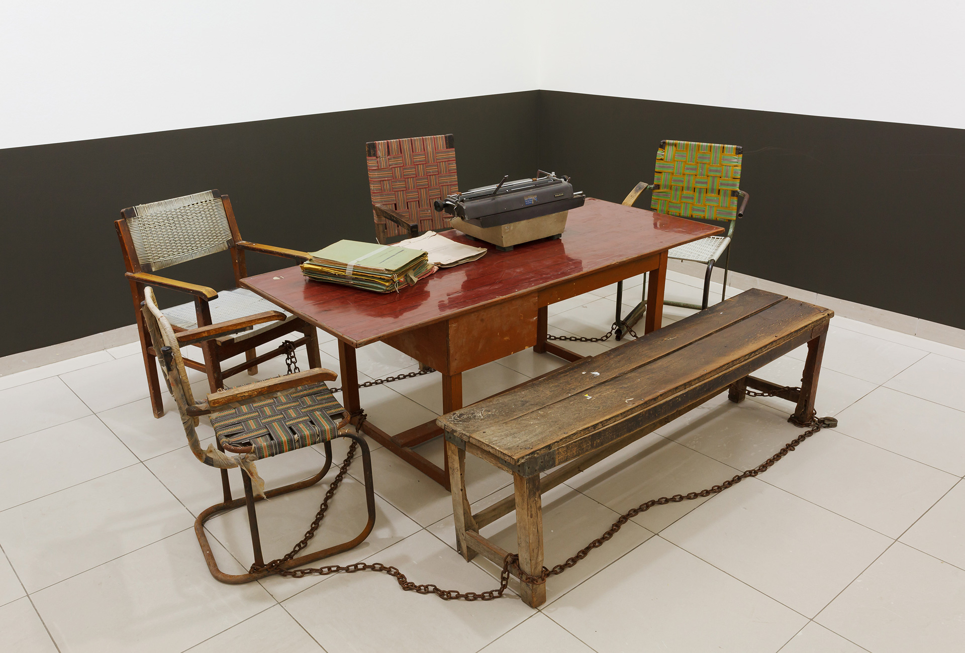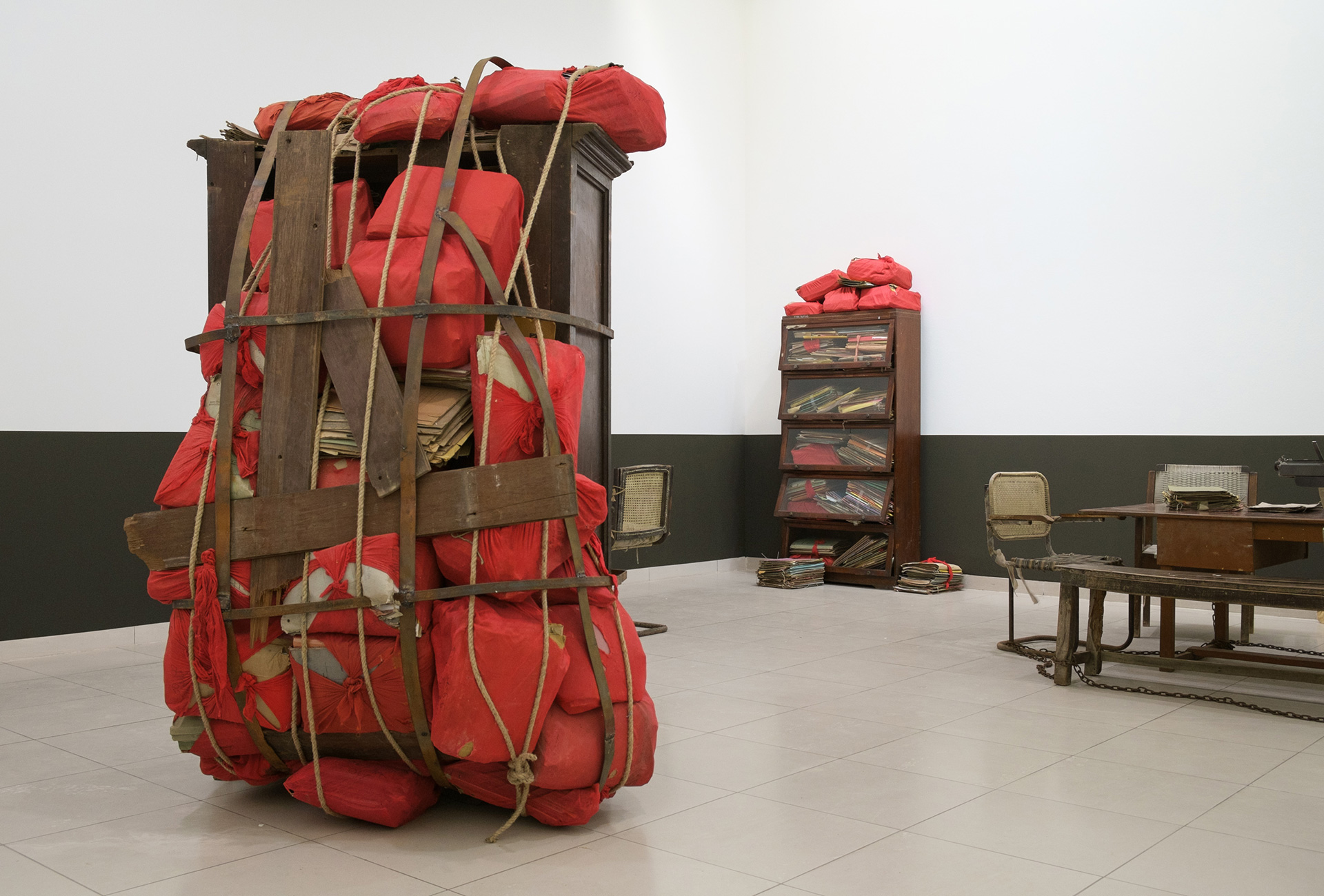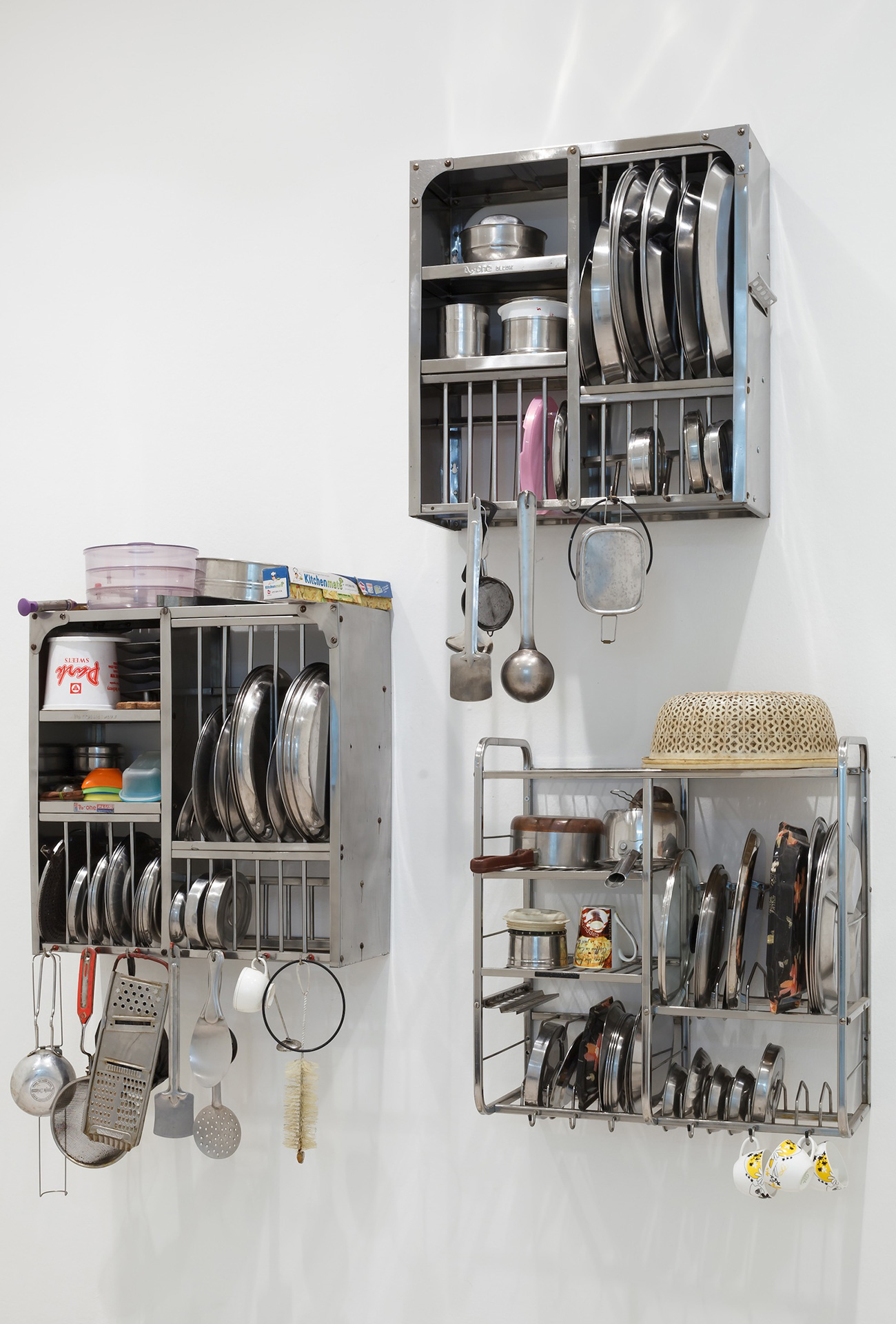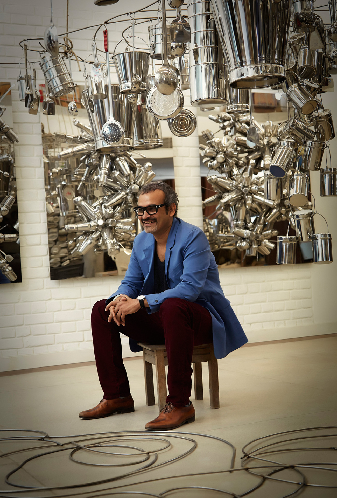 Die Ausstellung Everything Is Inside von Subodh Gupta ist inspiriert vom Alltag seines Heimatlandes. Der indische Künstler portraitiert eine Gesellschaft, die sich durch den wirtschaftlichen Aufschwung der letzten Jahrzehnte rasant wandelt. Die Entwicklung kontrastiert mit traditionellen Werten, der Spiritualität und Religion der Bevölkerung. Die entstehende Spannung nutzt Gupta für seine Skulpturen, Gemälde, Videos und performativen Arbeiten. Unmengen von Blechwaren häufen sich auf dem Boden in der zentralen Halle des MMK. Hier und da ragen Wasserhähne aus dem Berg abgenutzten, einfachen Geschirrs. Sie bewässern das Objekt This is not a fountain (2011–2013). Die Einzelteile der Installation, die auf ein Gemälde von Matisse anspielt, hat der Künstler über Jahre hinweg gesammelt. Unweit schmiegen sich zwei goldfarben angemalte Fahrräder mit mehreren Milchkanistern aneinan- der. Der Titel Two Cows (2003–2008) beschreibt eine mögliche Assoziation. Die Frage ist, ob sich der aufgehäufte Überfluss an scheinbar banalen Einzelteilen auch als Konsumkritik lesen lässt? Ist sein Werk auch eine Dokumentation des menschlichen Egoismus und Größenwahnsinns? Sicher ist: Gupta inszeniert die Spuren menschlicher Bedürfnisbefriedigung.