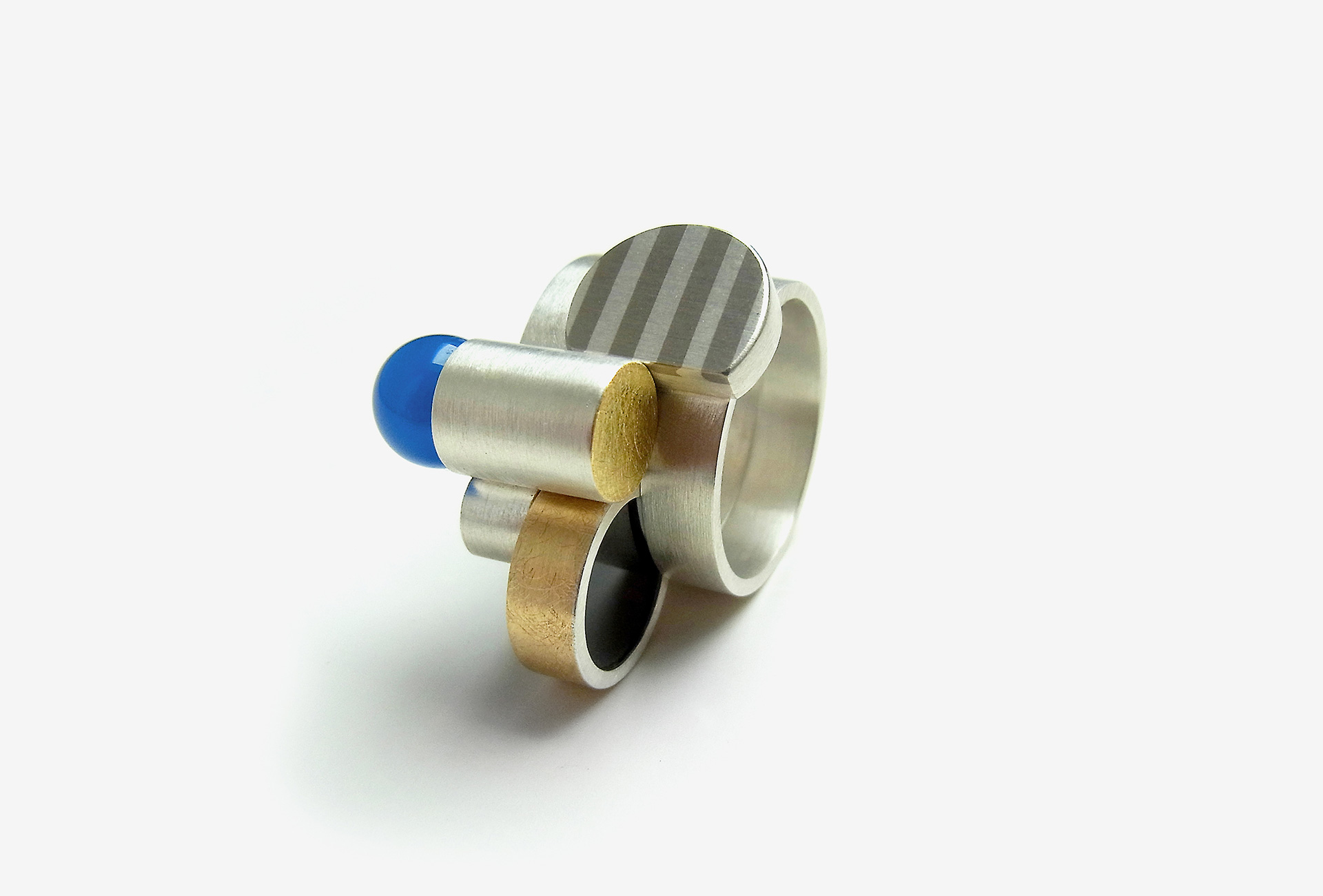 Ringsystem Aus drei mach (d)eins. Silber, Gold, Palladium, Achat.