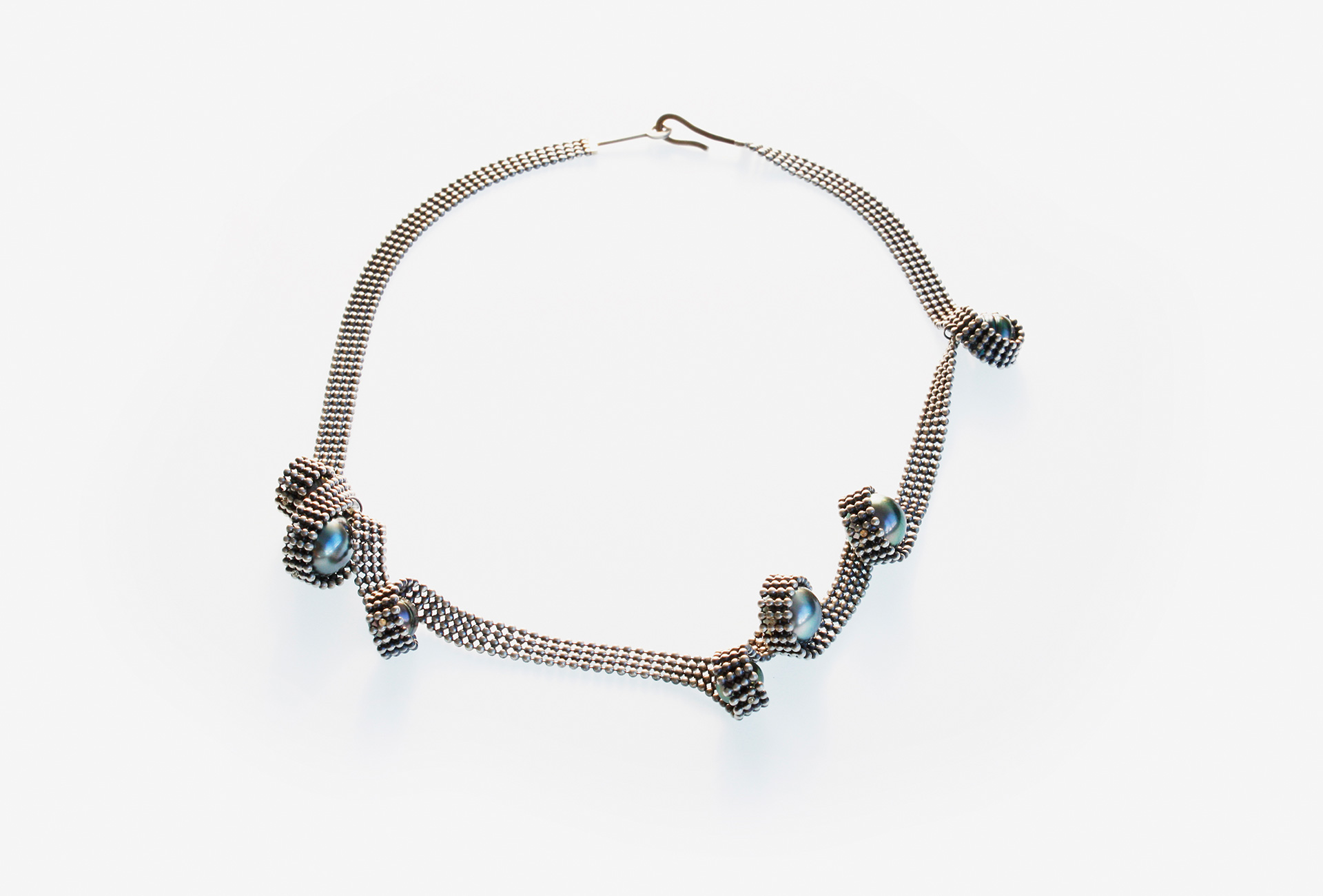 Halsschmuck Squiggle. Silber 925, teilweise oxidiert, Tahitiperlen.