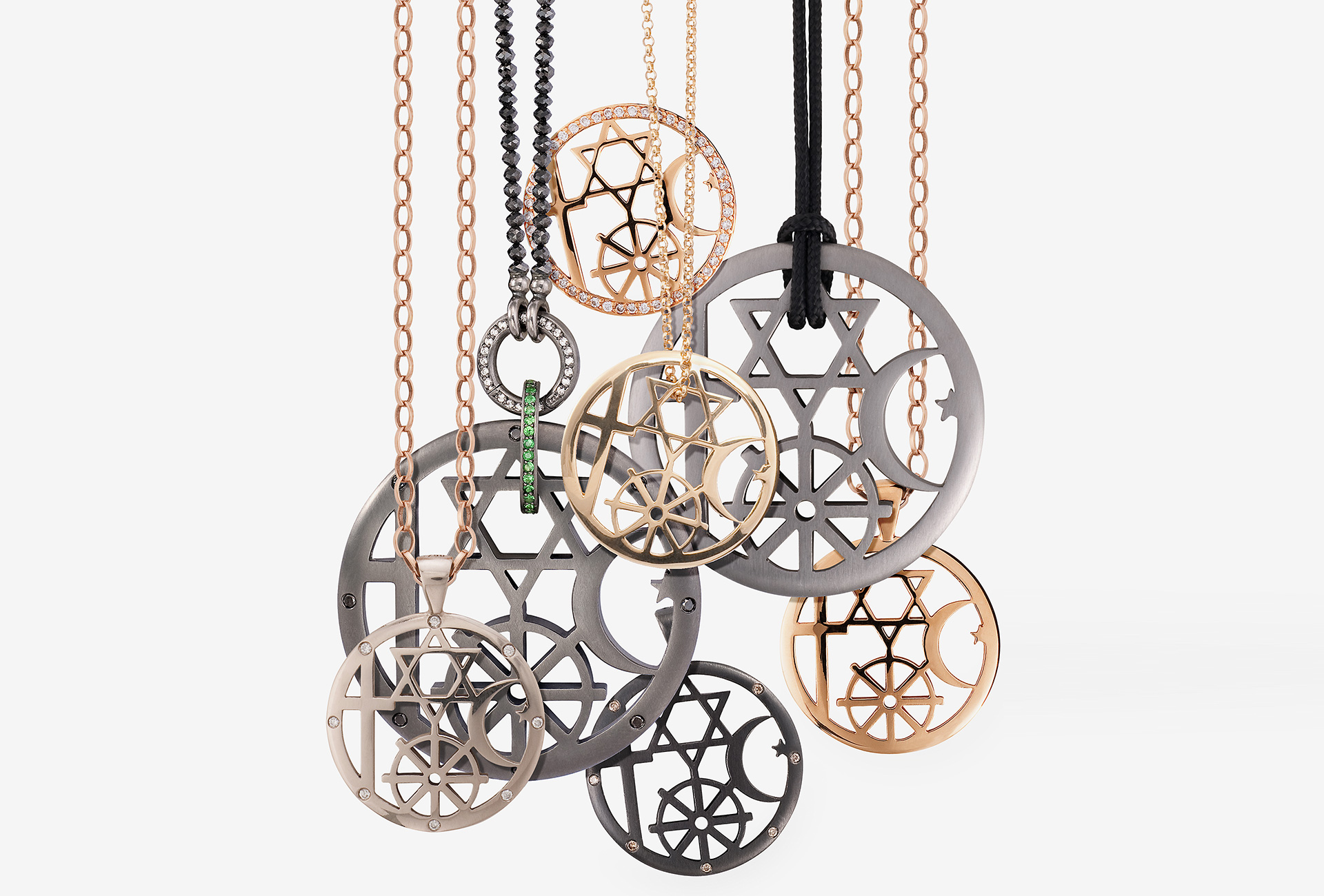 Anhänger Unita, vier Weltreligionen im Einklang. Rotgold, Gelbgold, Silber schwarz rhodiniert, Tsavorite, Brillanten. Photo Barbara von Woellwarth.