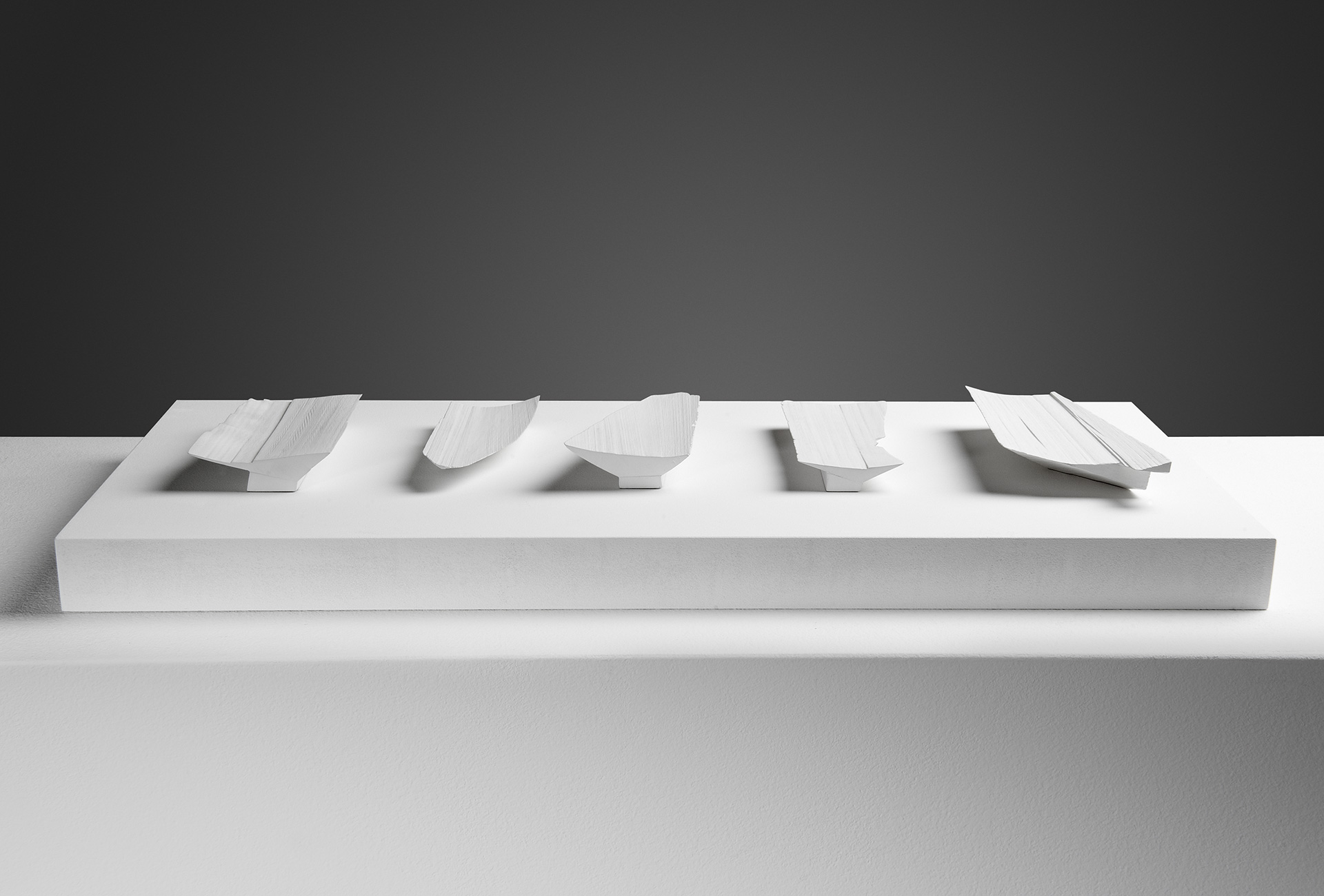 Fünf Schalen für 5 Ringe einer Hand. Holz, Mischtechnik, Sockelplatte lackiert, 75 × 24 × 55 cm. Foto Brigitte Lerho.
