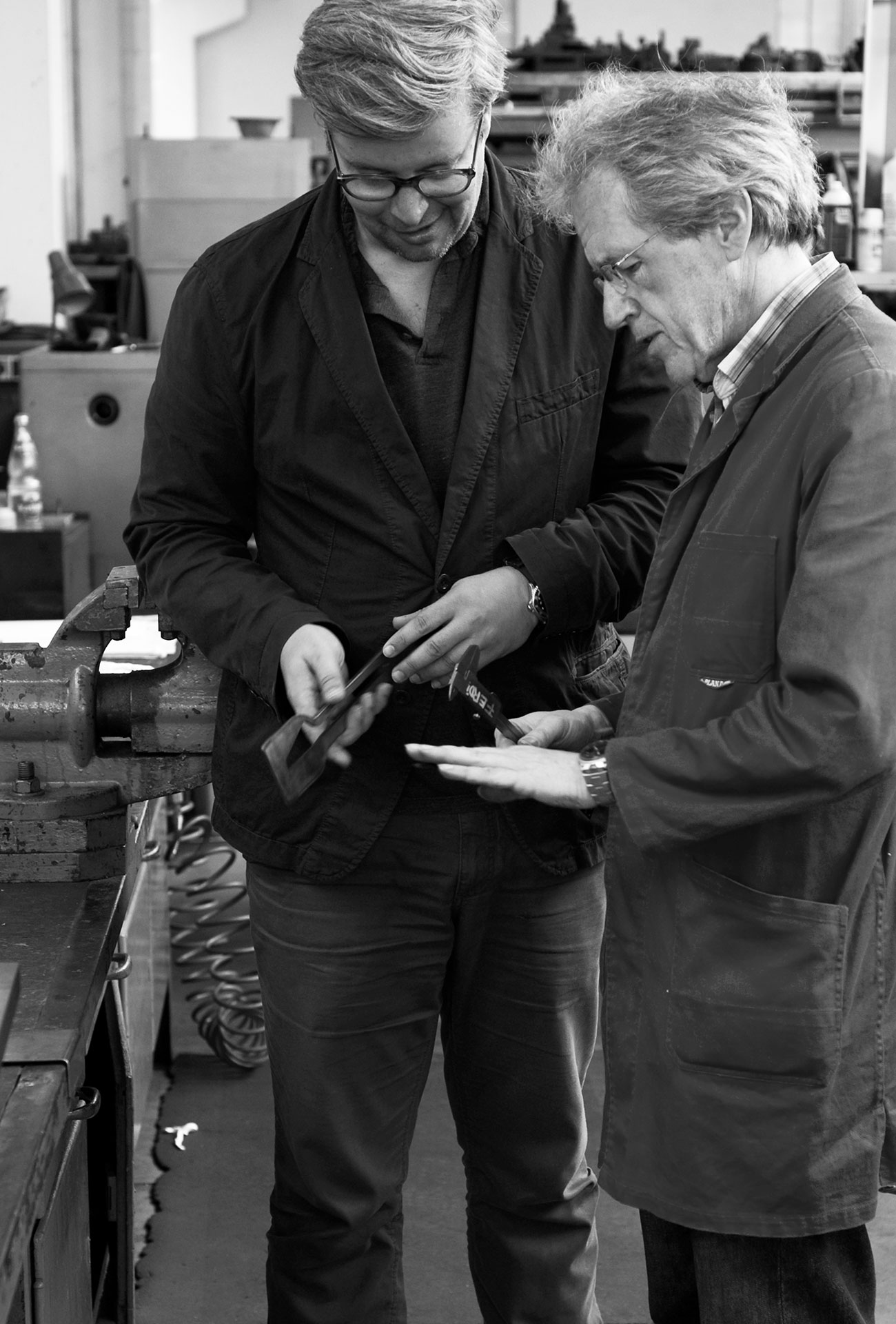 Den Gefahren globaler Arbeitsprozesse, die das Entwerfen und Herstellen komplett voneinander abkoppeln, begegnet Feichtner seitdem mit einer Gegenoffensive. Die Angebote Kettensägen oder Bohrmaschinen lehnte er ab, „weil ich nur noch Lust hatte, meine Gestaltung mit etwas Handwerklichem zu verbinden, etwas zu produzieren in einer unmittelbaren Umgebung und daraus eine Partnerschaft entstehen zu lassen, die eher einer Freundschaft gleicht, dem Teilen eines gemeinsamen Interesses oder einer gemeinsamen Neugier, statt eines gegenseitigen Profitversprechens.“ Und so seien dann Dinge entstanden, wo er neben dem Silberschmied gesessen, mit ihm geschliffen, gefeilt und probiert habe. „Das hatte eine ganz andere Qualität für mich und ich war plötzlich wieder glücklich.“ Seither entwickelt Feichtner zusammen mit Handwerkern Stühle, Trinkgläser, Fruchtschalen und Vasen, eine Saliera für das 21. Jahrhundert oder einen Armreif von goldener Geometrie. „Meine Familie lebt mit meinen Möbeln, meine Neffen essen mit meinem Besteck und Geschirr. D.h., ich habe einen unmittelbaren Einfluss auf meinen Alltag. Und das ist mir wichtig.“ Statt CAD-Programmen und Rapid Prototyping braucht Feichnter für seine Entwurfstätigkeit nichts als Bleistift und Papier. Die Skizze in der Hand, geht er über die Straße, in die Modellbauwerkstatt oder gleich in die Manufaktur. Denn egal, ob es um die Wandstärke des Metallblechs für ein Besteck geht, oder um den Charakter eines Porzellangefäßes nach dem Brennvorgang — ohne die Expertise, Erfahrungswerte und Fertigkeiten eines Handwerkmeisters geht es nicht.