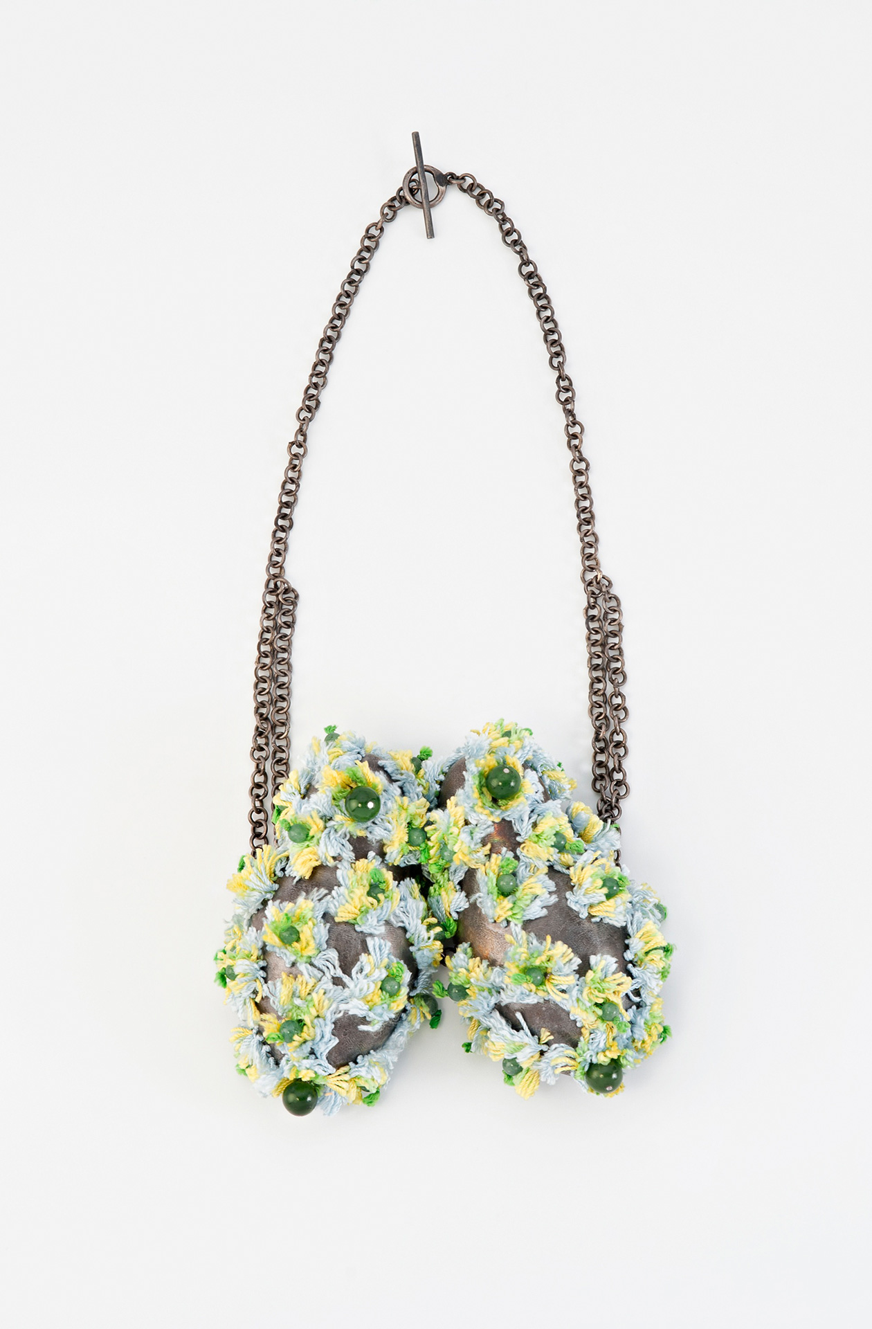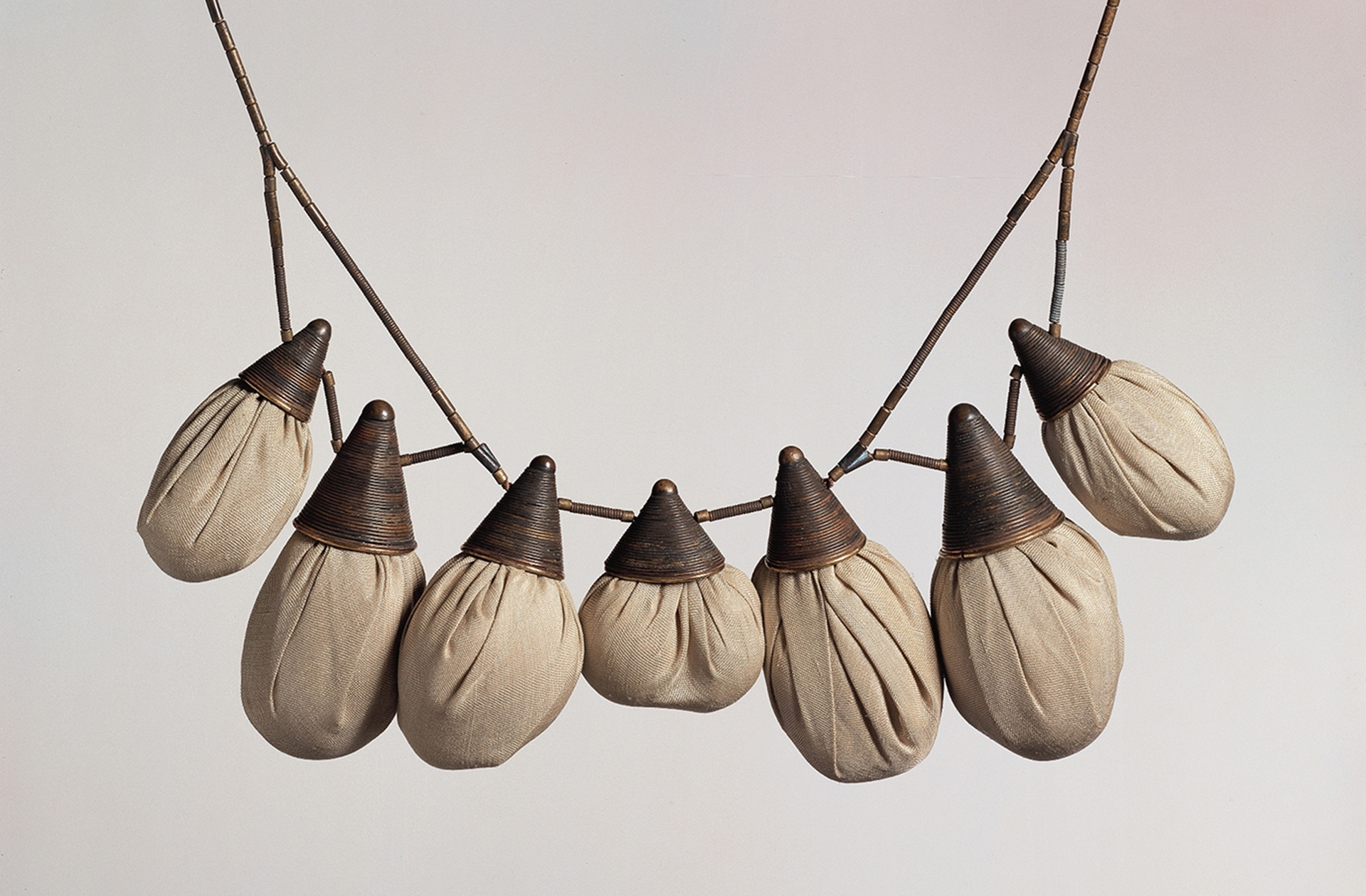 Halsschmuck, 1977. Kupfer teilweise vergoldet, Kieselsteine in Seidenstoff, Silber. Foto Rüdiger Flöter.