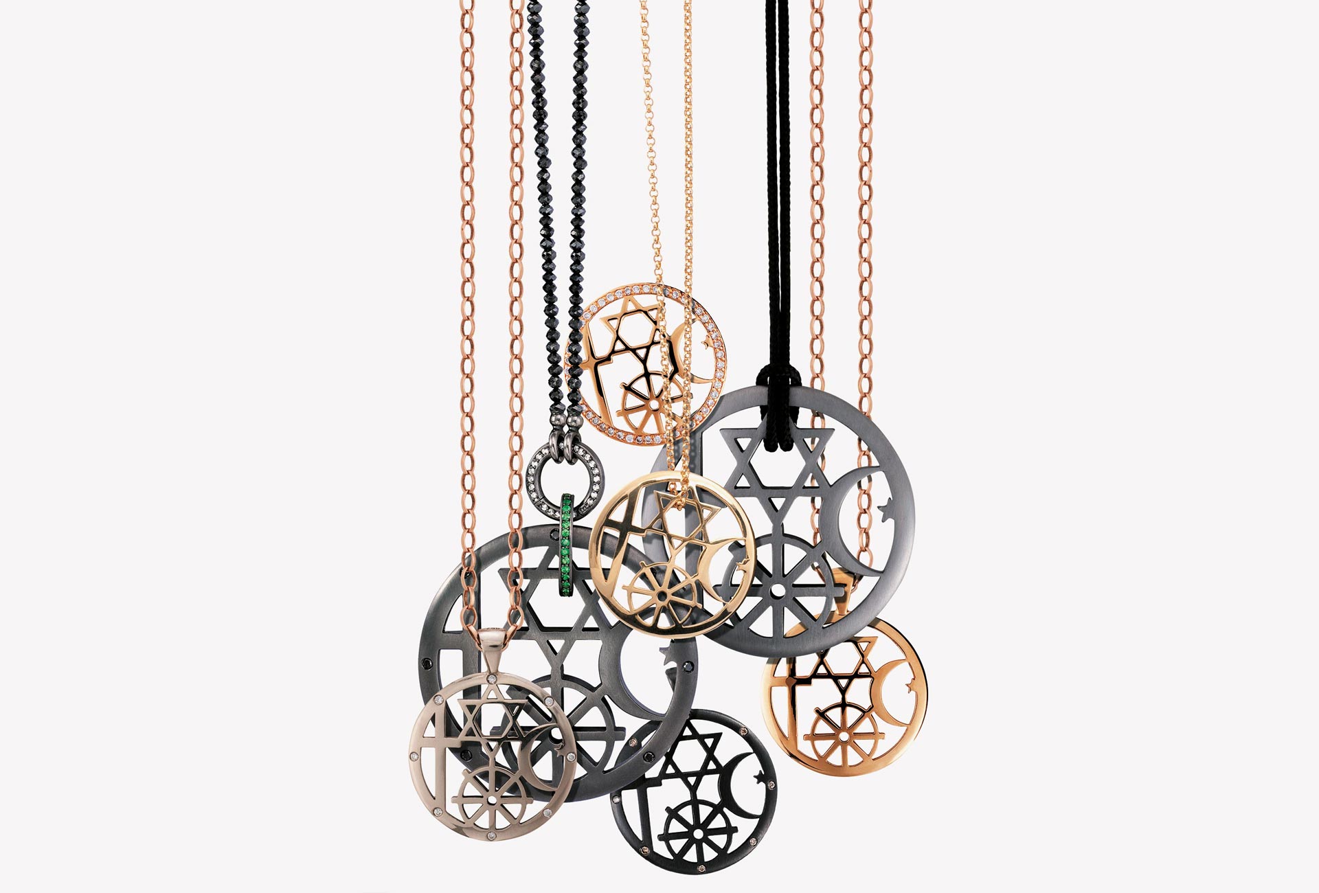 Halsketten ‚Unitas‘ Vier Weltreligionen im Einklang, Christentum, Judentum, Islam und Buddismus. Gelb-, Rot-, Weißgold 750, Silber, Brillanten, Tsavorite