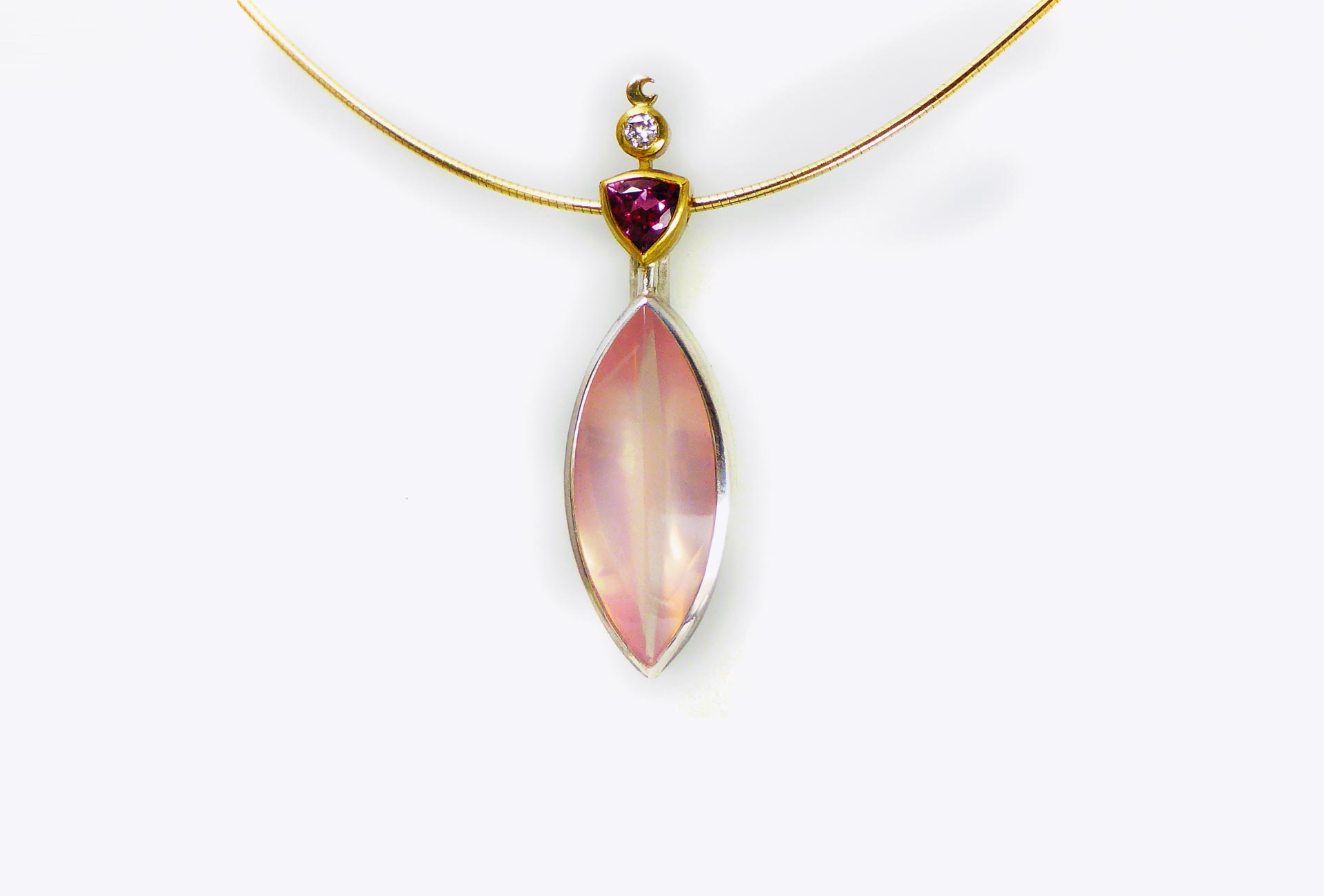 Anhänger Chamunda – Göttin der Klarheit des innersten Herzens. Silber, Feingold, Rosenquarz, pinker Turmalin, Brillant, H 6 cm