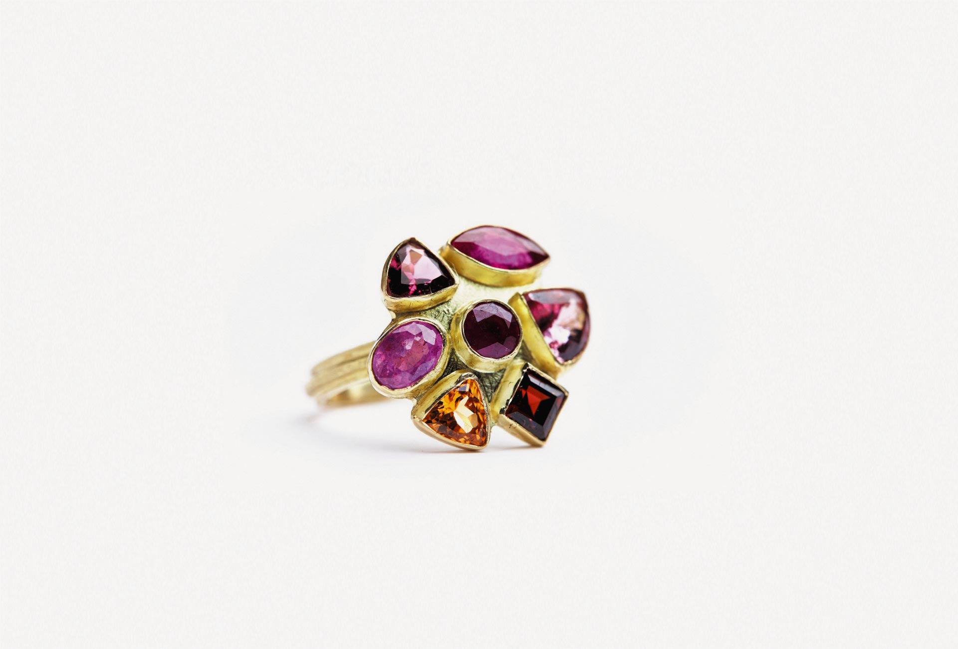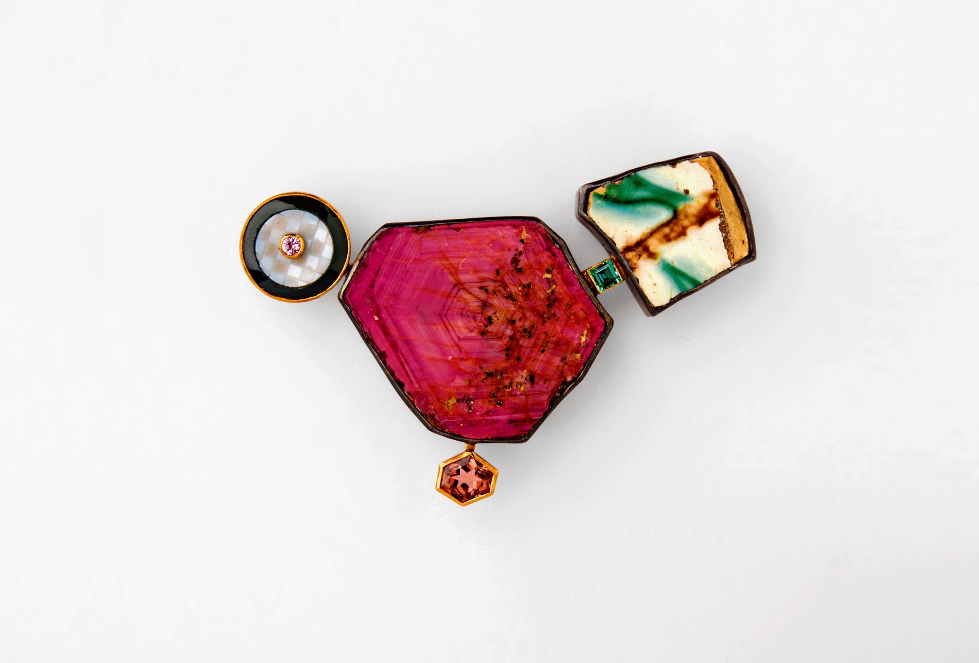 Brosche, 2008. Gold 750, Silber 925, Keramik (Mallorca), Turmaline, Rubin, antiker Grünachat mit weißer Achat-Intarsie und rosa Saphir. Photo Olaf Maikopf