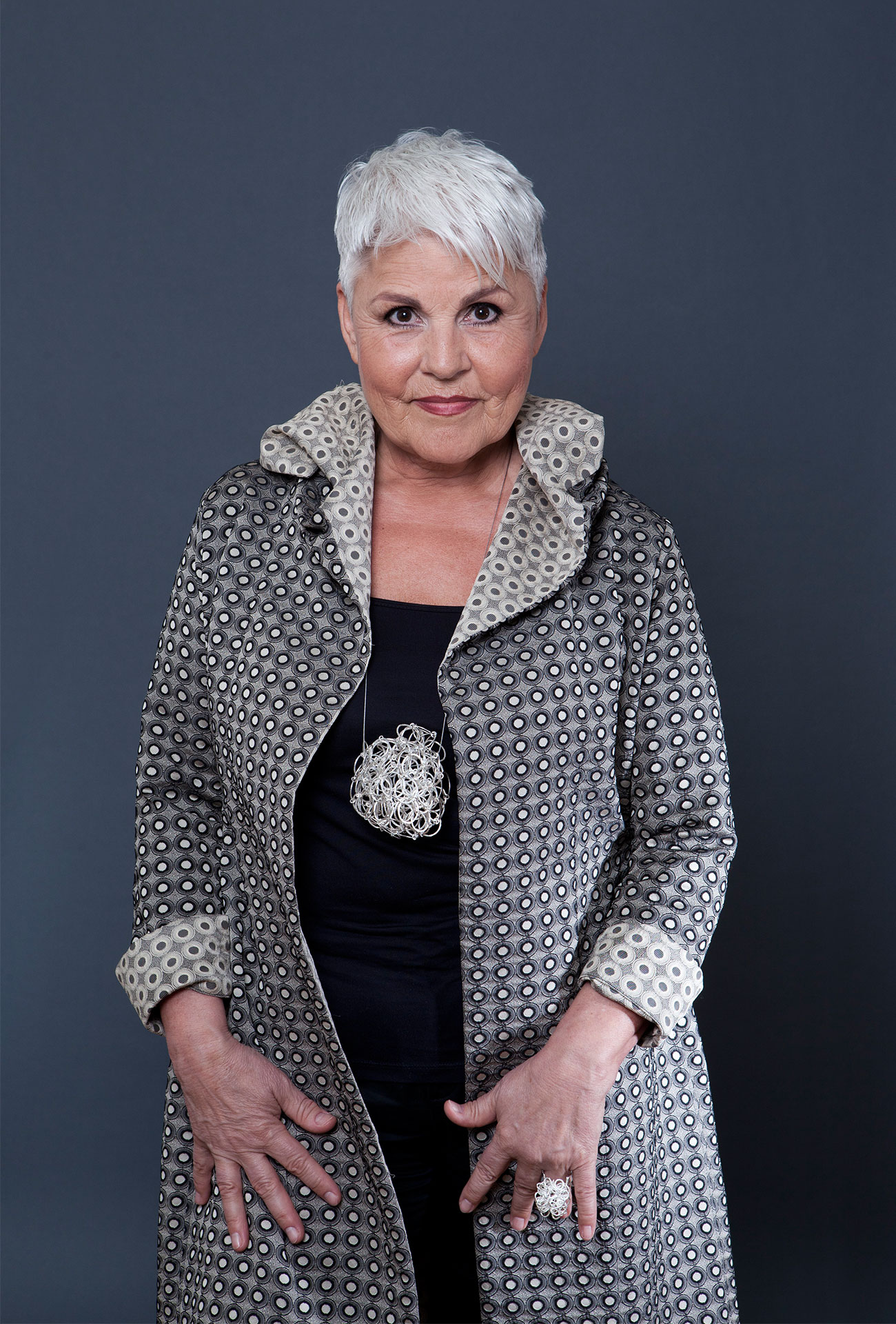 Angela Gilow mit Halsschmuck von Nikolay Sardamov, Silber, Galerie Isabella Hund, und Mantel von Barbara Weigand, Iosoy, Jacquard. Foto Miriam Künzli für Art Aurea.