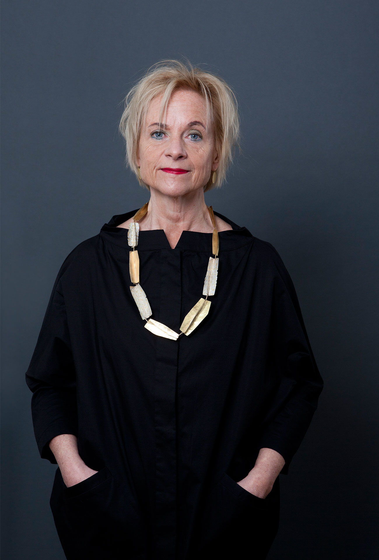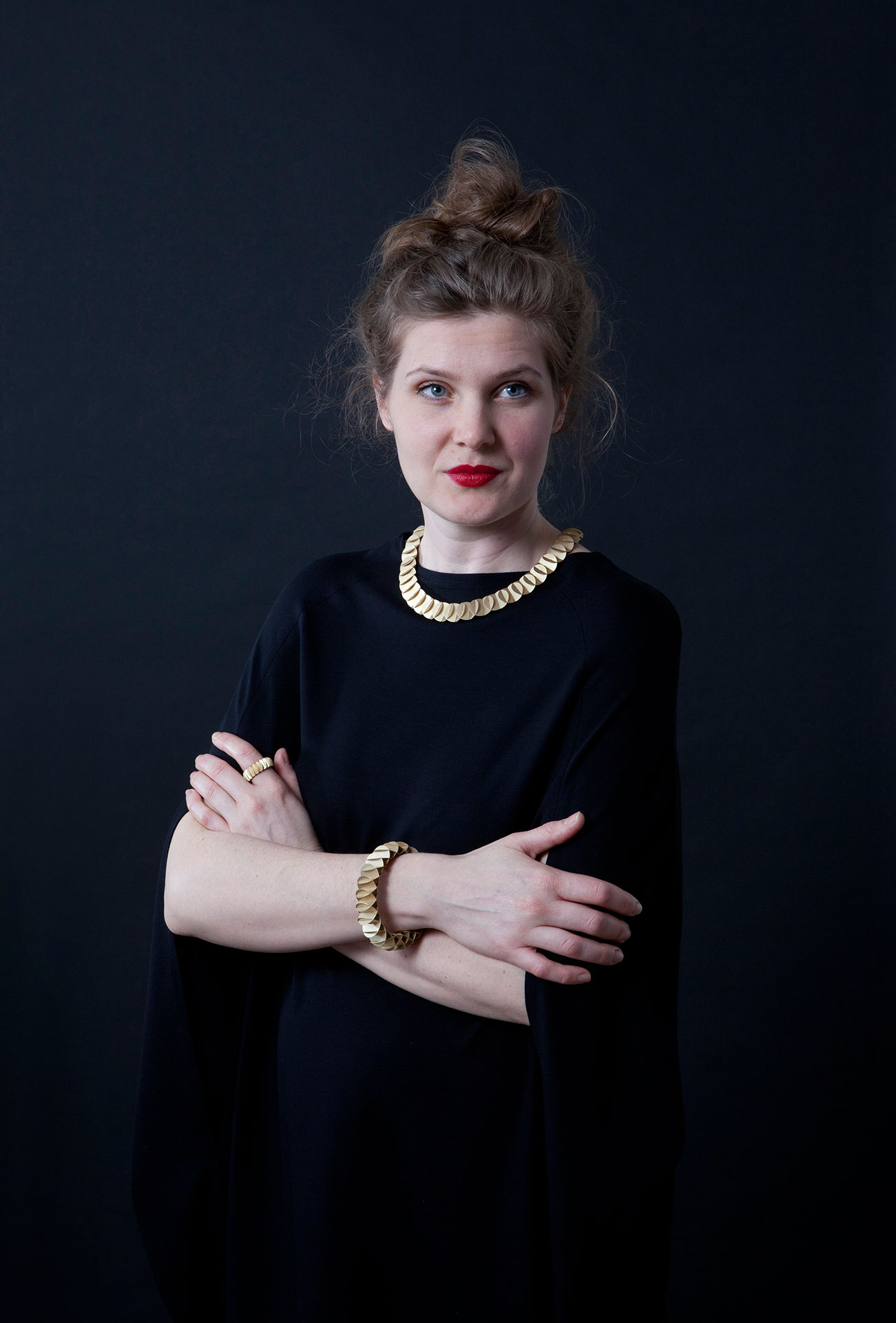 „Ich war überrascht über die Wirkung des Schmucks an mir. Als Schmuckkünstlerin mache ich etwas komplett anderes. Aber der Ring fühlte sich fantastisch an. Die Beweglichkeit der Stücke, vor allem des Rings und des Armbands und wie die Kette am Hals liegt, ist faszinierend.“ Lynne Philippé, Düsseldorf, Schmuckkünstlerin
