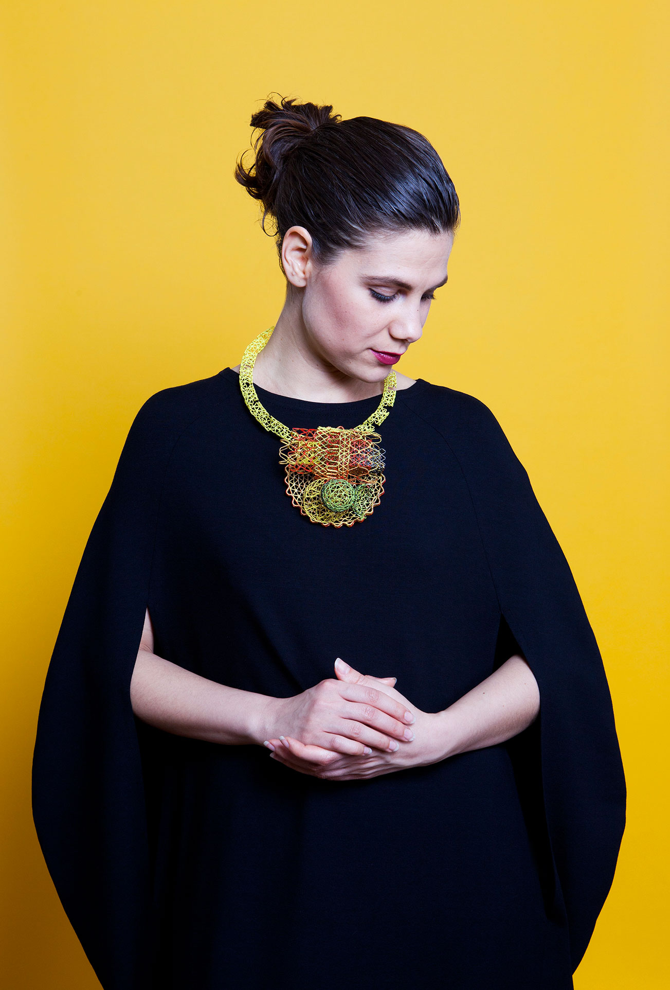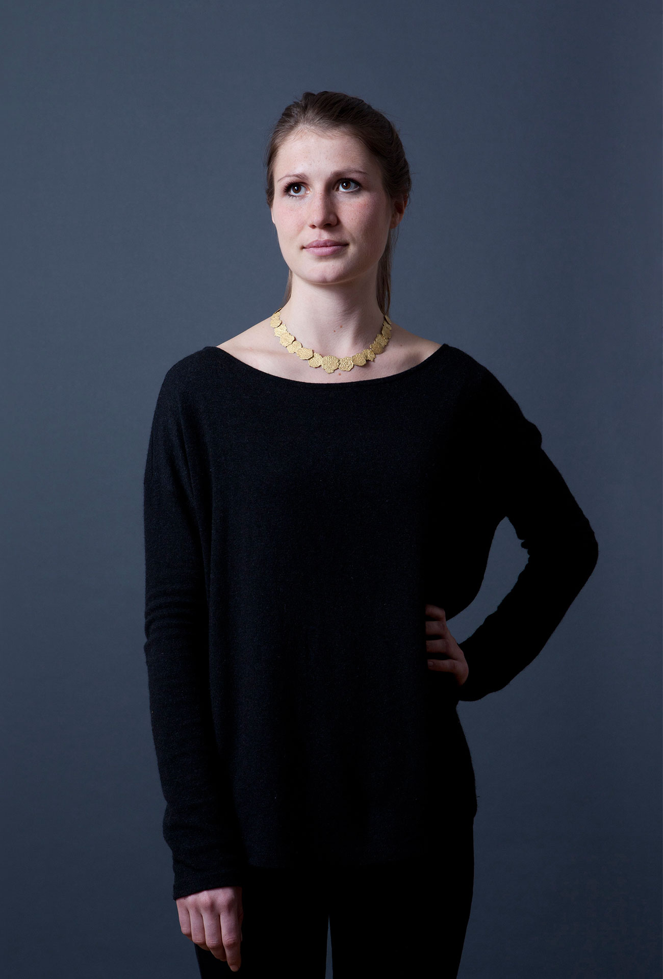 Paulina Tsvetanova mit Halsschmuck von Robert Baines, Galerie Biro, und Kleid von Ilona Pelli. Foto Miriam Künzli für Art Aurea.