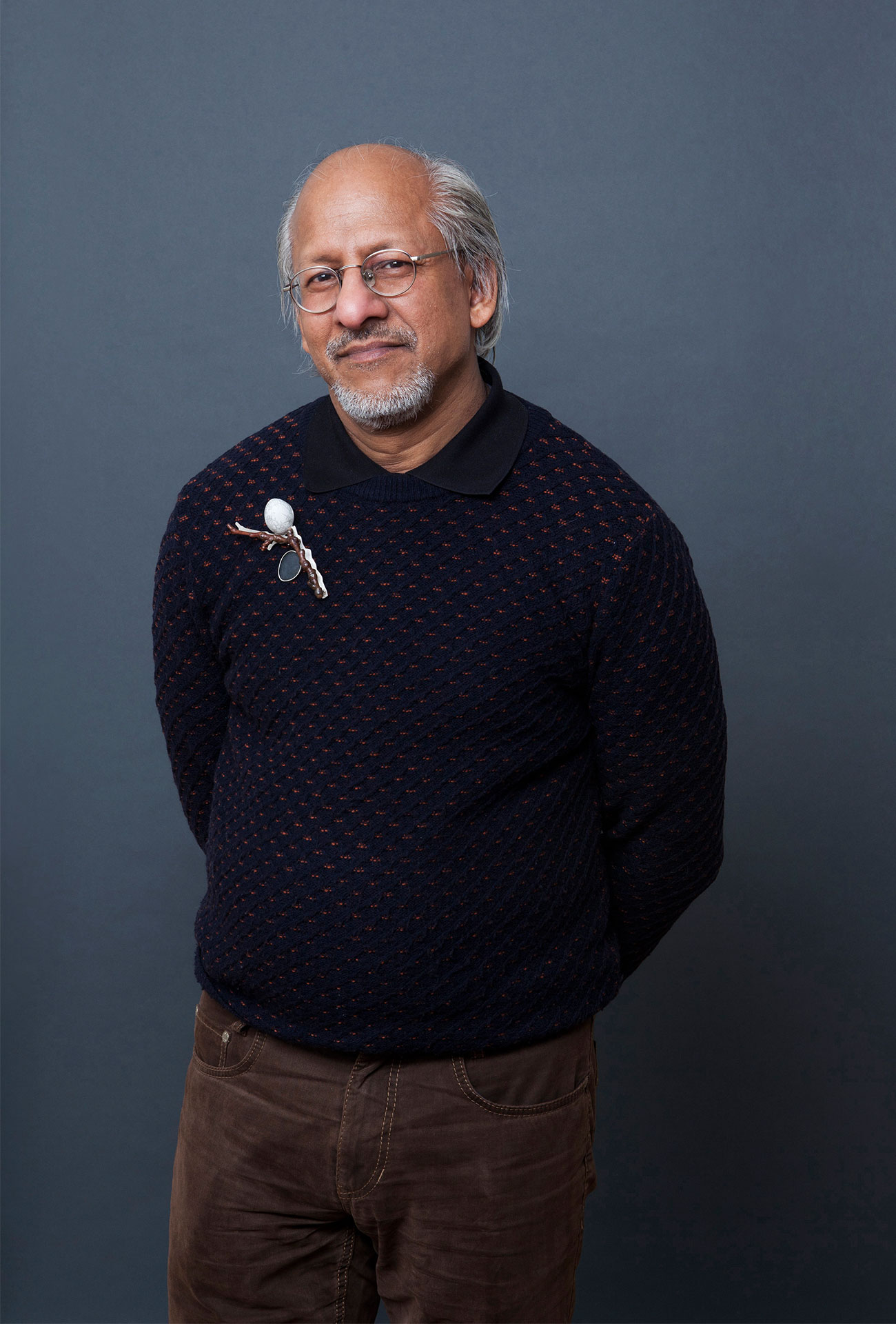 Pravu Mazumdar mit Brosche von Anja Eichler, Silber, Wachtelei, Holz, Stahldraht. Foto Miriam Künzli für Art Aurea.