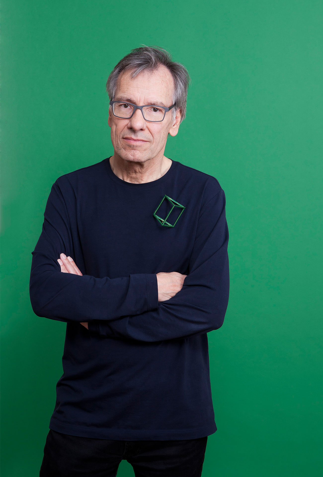 „Ich habe mich für die Brosche von Francesco Pavan aus zwei Gründen entschieden: erstens, gefällt mir die architektonische, minimalistische Form und auch die Farbe Grün, zweitens schätze ich diesen Pionier der Goldschmiedekunst aus Padua persönlich sehr. Während meines Porträts habe ich gemerkt, wie schwer es ist bei einer solchen Fotografie locker und authentisch zu bleiben.“ Reinhold Ludwig, Ulm, Art Aurea-Verleger