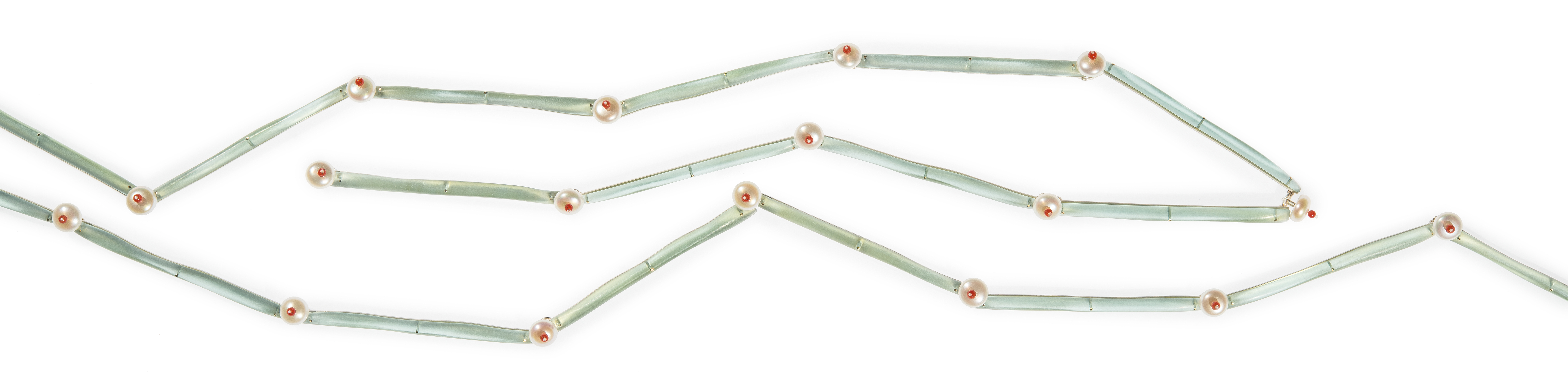 Kette „Zartgrün“. Silber, Gold, Acryl, Perlen, Korallen / Photo David Franck