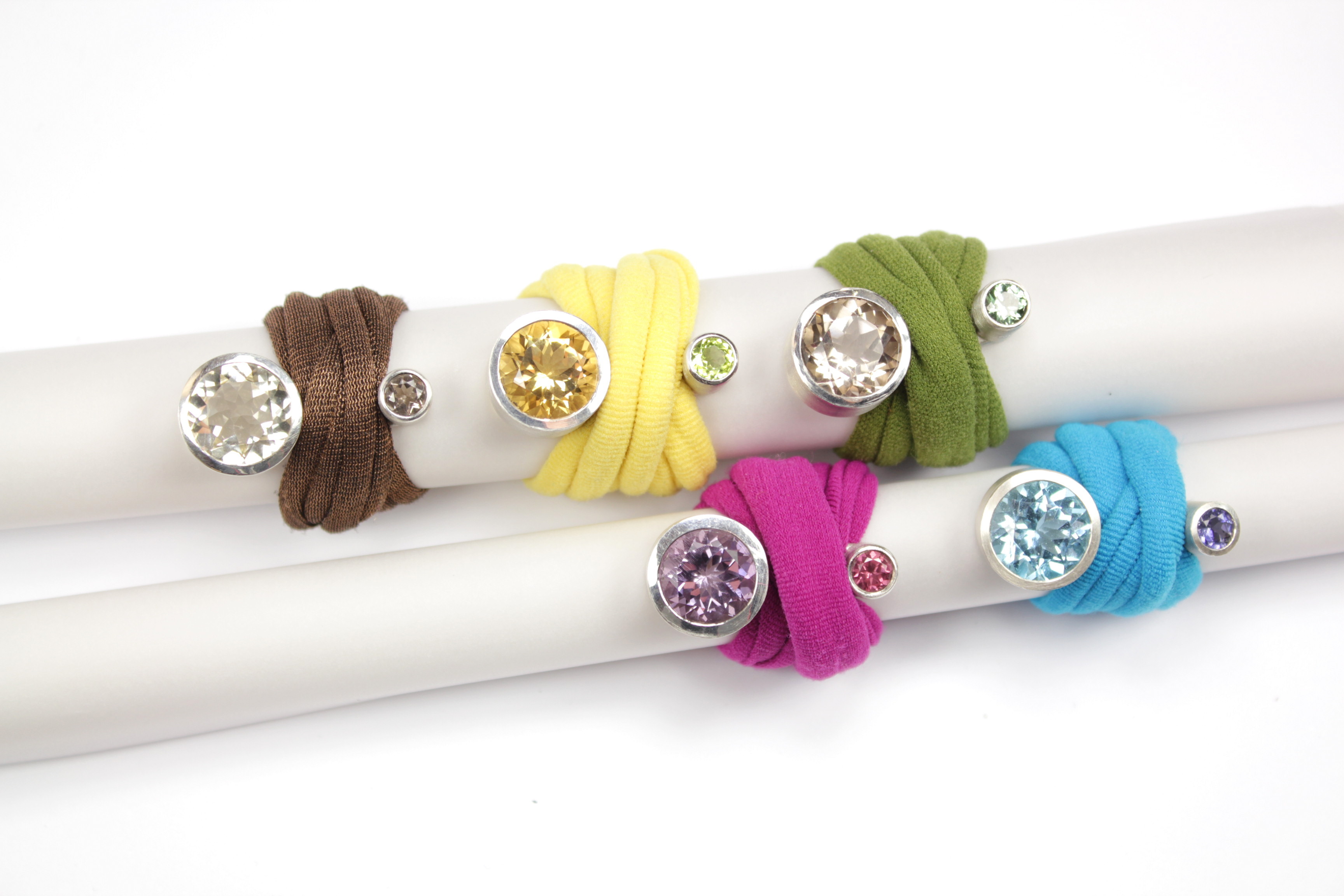Ringserie „…um den Finger gewickelt…“. Silber mit verschiedenen Edelsteinen und austauschbarem Stoffband