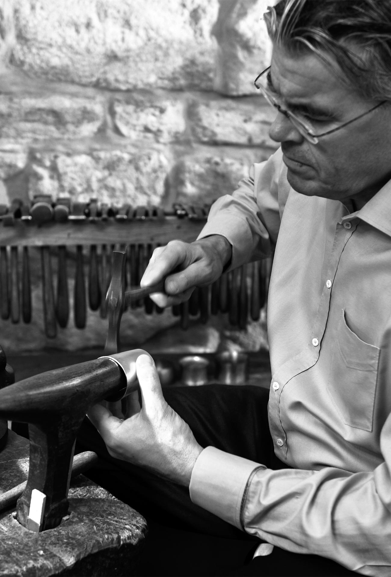 Für Lothar Kuhn verkörpert der Feingoldring, gefertigt in seinem Atelier, „ein Stück Unendlichkeit“. Seine Ausstrahlung erhält er durch die geschmiedete Oberfläche von purem Gold 999. Sechs Wicklungen, die als unendliches Band erscheinen, vermitteln Harmonie und auch ungetragen eine skulpturale Qualität. „Wir sind Goldschmiede aus Leidenschaft und haben unsere eigene Handschrift, die ständig überprüft und weiterentwickelt wird.“ Liebe zur Handwerkskunst und den Rohstoffen sei die Voraussetzung, sagt der Goldschmiedemeister und ergänzt: „Unsere Kuhnstücke werden hier in Esslingen erdacht und für unsere Kunden angefertigt.“ Erstklassige Handarbeit sei für jeden seiner Goldschmiede selbstverständlich. Immer mehr gehe es seinen Kunden um „ihr“ Schmuckstück, das einzigartig und sehr persönlich für sie angefertigt werde. „Dabei spielt auch eine Rolle, dass meine Mitarbeiterinnen schon lange hier im Betrieb mitarbeiten und von Ihrer Arbeit leben können.“