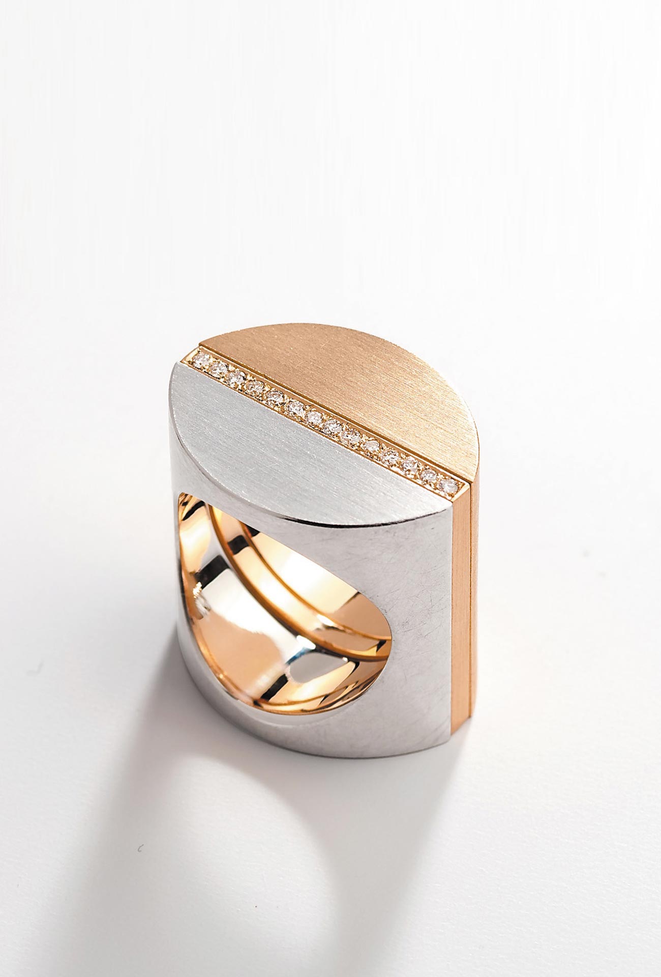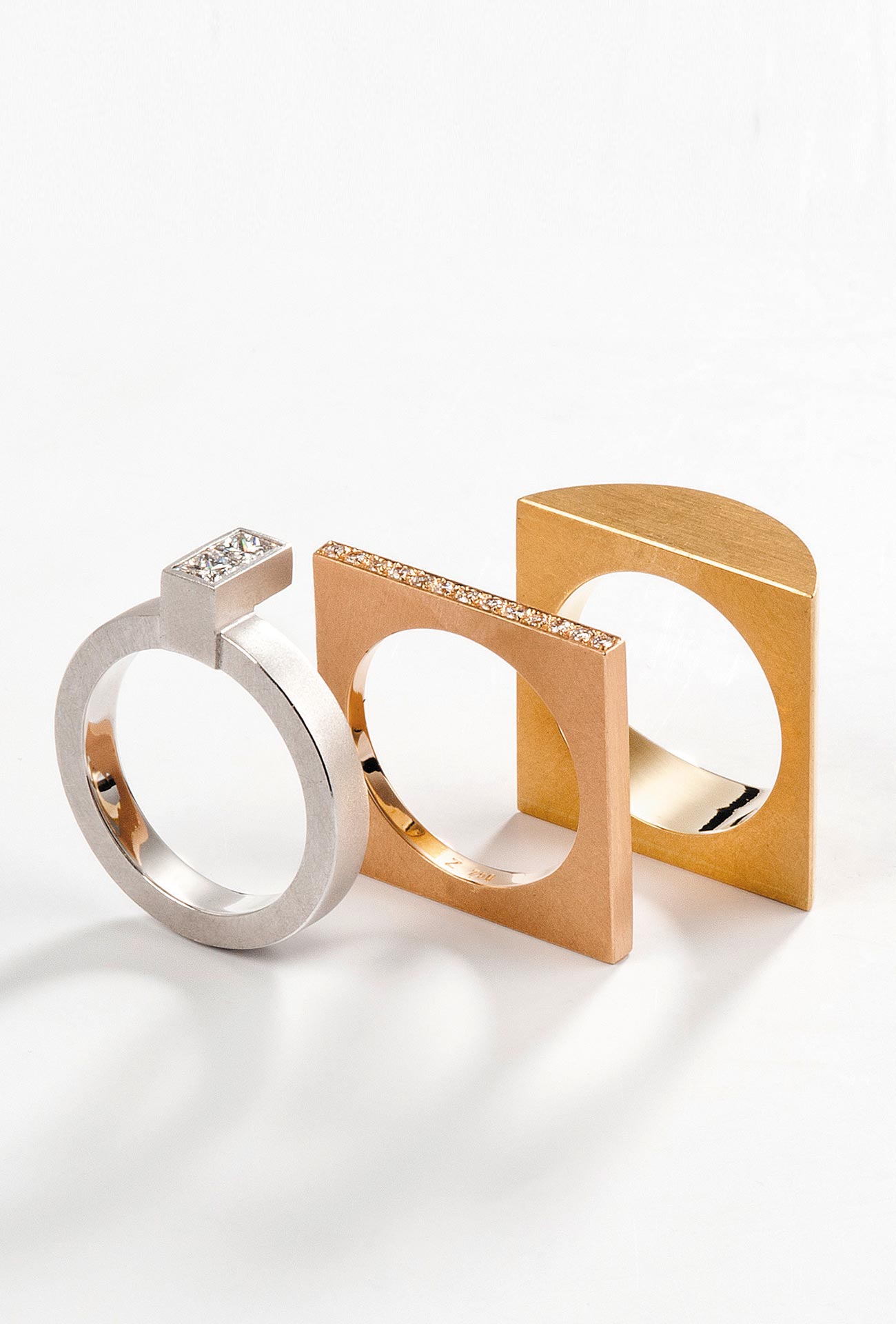 Die Ringkollektion Schichtwechsel, gestaltet von Michel Bischoff, besteht aus 30 unterschiedlichen Elementen, die verschieden kombinierbar sind. Die ersten Varianten entstanden bereits in den 1990er Jahren. Das Modell Halbrund sei bereits ein Klassiker und nehme eine Schlüsselrolle ein, sagt Matthias Zimmer. Es verbindet Wölbung und Fläche, die Element lassen sich ergänzen, wechseln und um 90° drehen. „So entfacht Halbrund Sammelleidenschaft“, sagt der Juwelier. Angenehme Proportionen und fühlbar gute Tragbarkeit blieben dabei erhalten. „Die kulturelle Relevanz erhält unsere Schichtwechsel Ringkollektion in erster Linie durch die Anerkennung unserer Kunden“, sagt Zimmer. Bestätigt wird dies durch einen Designpreis und den Ankauf durch Museen. Zunehmend würden kultur- und designinteressierte Schmuckliebhaber aus der ganzen Republik solche Formen mit langlebigen Inhalten und die überraschende Kombinationsfähigkeit der Schmuckringe schätzen.