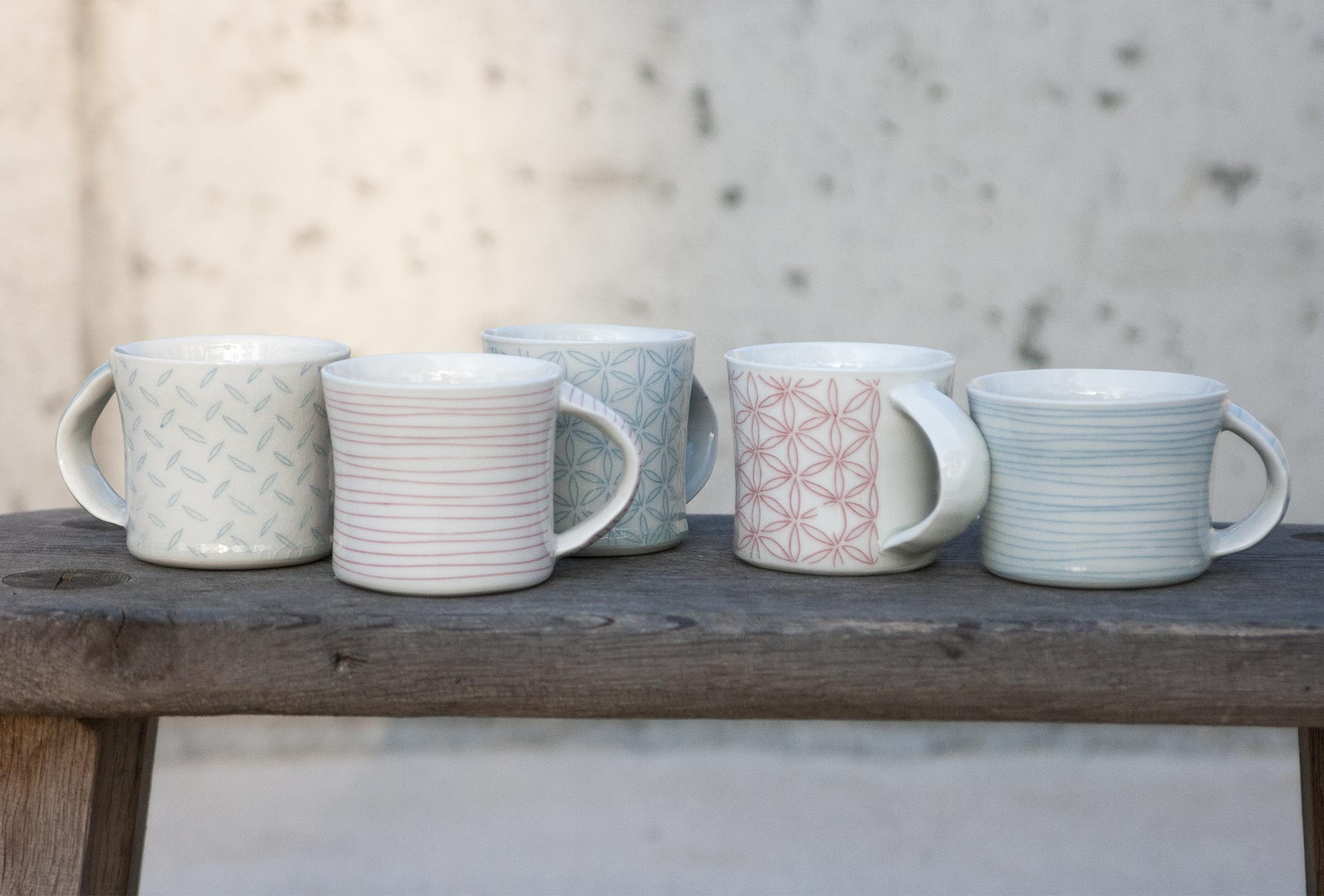 Porzellantassen, deren geritzte Linien mit Engobe ausgefüllt werden und wie einer