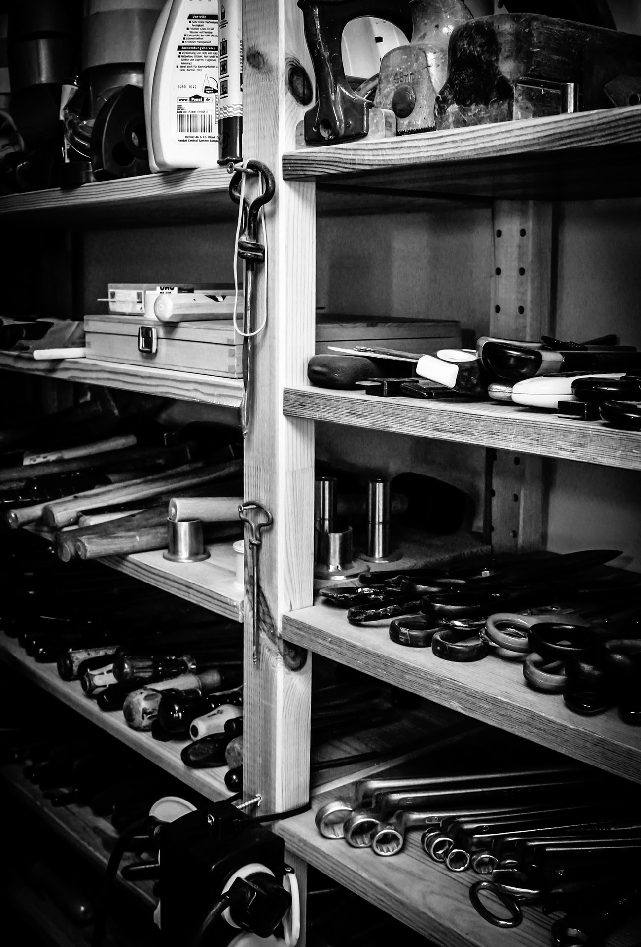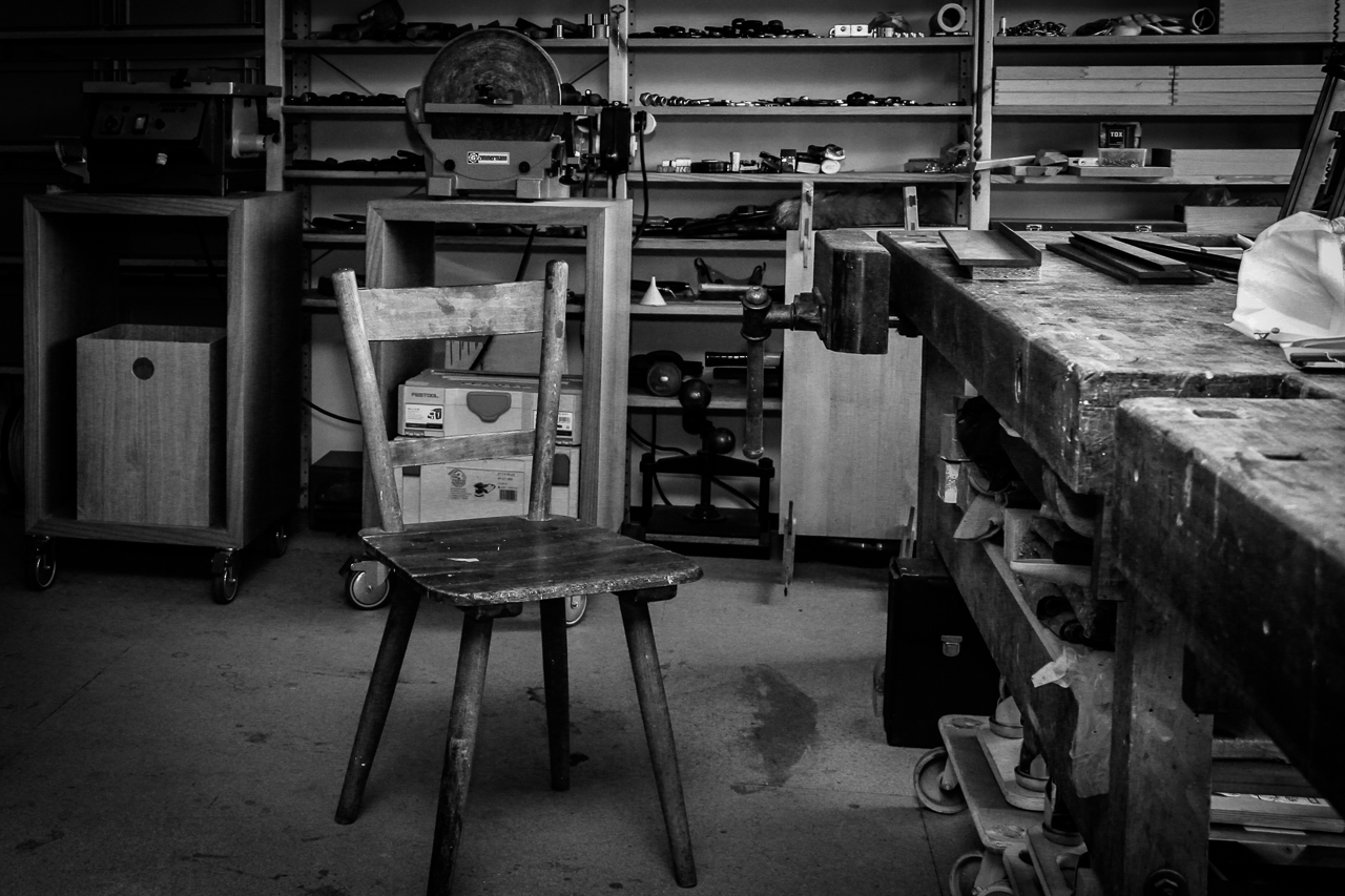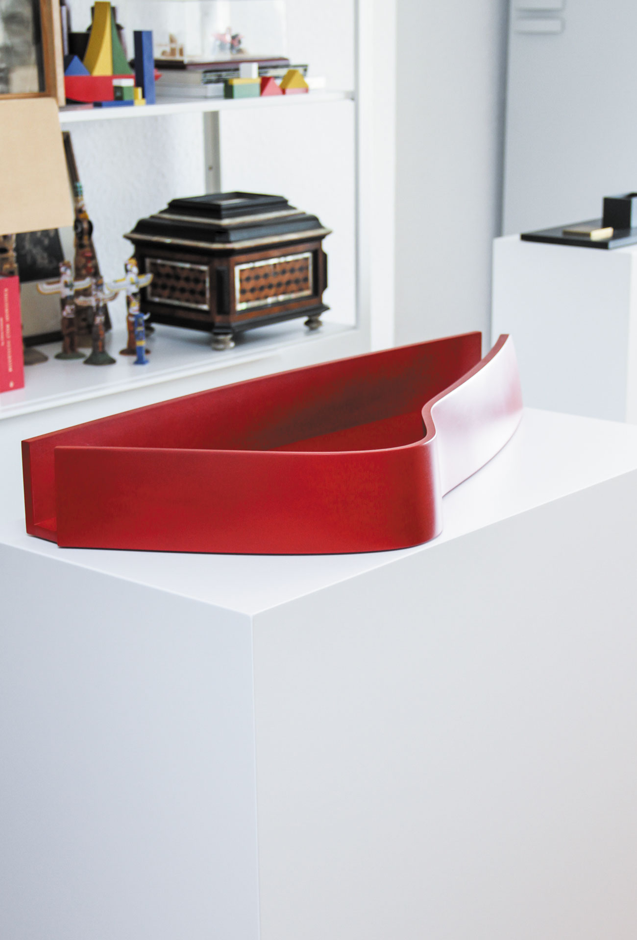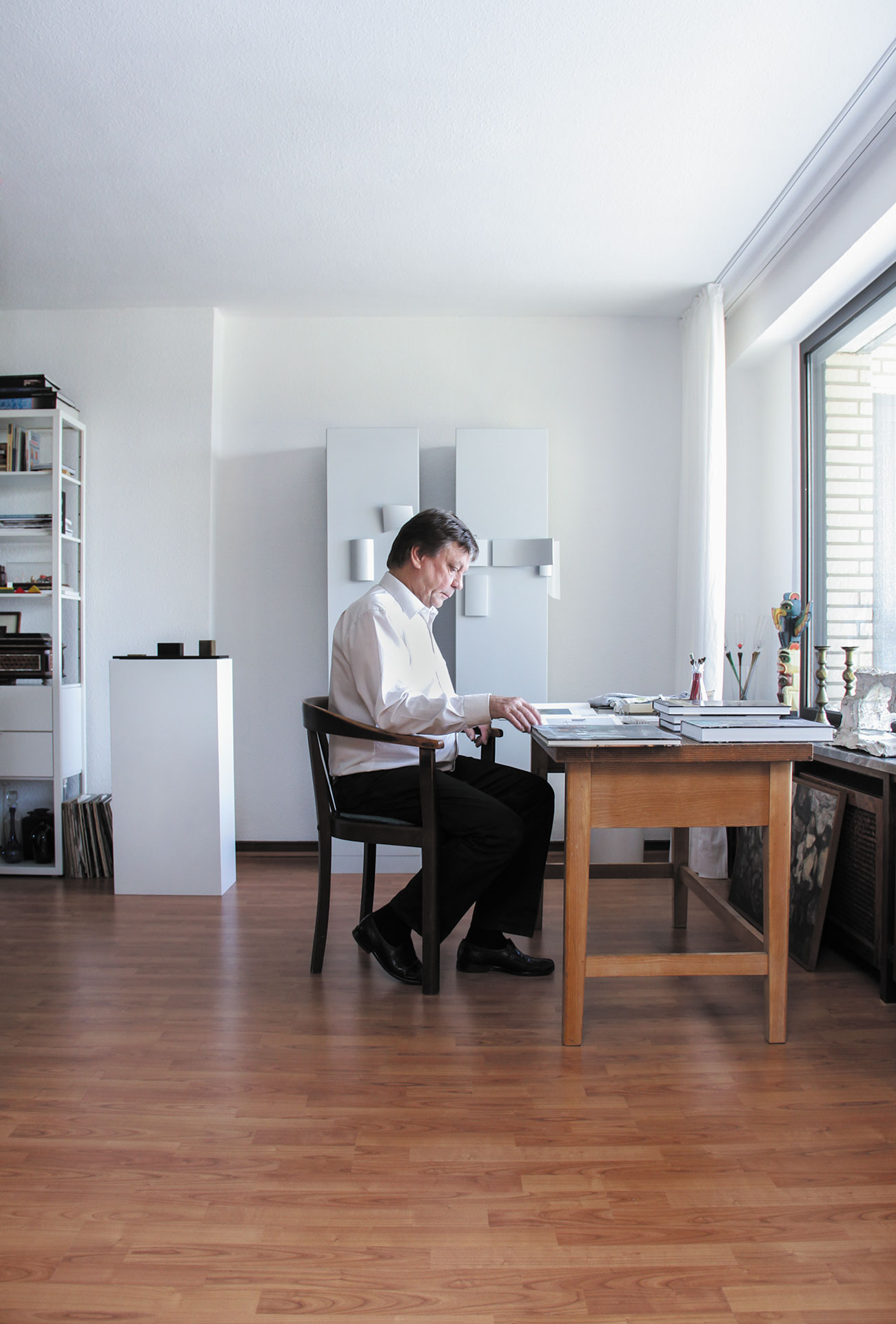 Unweit von Düsseldorf, im malerischen Leichlingen, wohnt Christof Lungwitz mit seiner Frau, einer Physiotherapeutin. Ein Haus am Hang, Mahagonitüren, Mosaiken… „Anfangs habe ich einen Schreikrampf gekriegt“, erzählt der 1948 in Weimar geborene Minimalist. Inzwischen genießt er es, sich auch zwischen diesen Dingen zu bewegen. „Ich lebe einen Widerspruch“, sagt er. Seit einigen Jahren fertigt der Gestalter puristische Objekte mit Namen wie „Schale für Ideen“ oder „Ablage für einen Winkeladvokat“. Die poetischen Titel entstehen intuitiv während der Arbeit. Mit seinem Schrank aus Lindenholz, dessen Oberteil die Naturform des Baumes bewahrt, wurde er in den 1990er Jahren bekannt. Fast jeden Tag steigt Lungwitz aus seinem Büro im Dachstuhl hinab in den Keller zu seinen Maschinen. Die aufgeräumte Werkstatt ist klein, bis knapp unter die niedrige Decke reichen die Regalwände voller Werkzeug, Hölzer und gesammelter Objekte. Begeisterung regt sich in seinen melancholischen Augen beim Gedanken an sein nächstes Projekt „Wunderkammerschränke – die Objekte, die ich reinlegen will, habe ich bereits.“ (Lesen Sie weiter am Ende der Bildstrecke)
