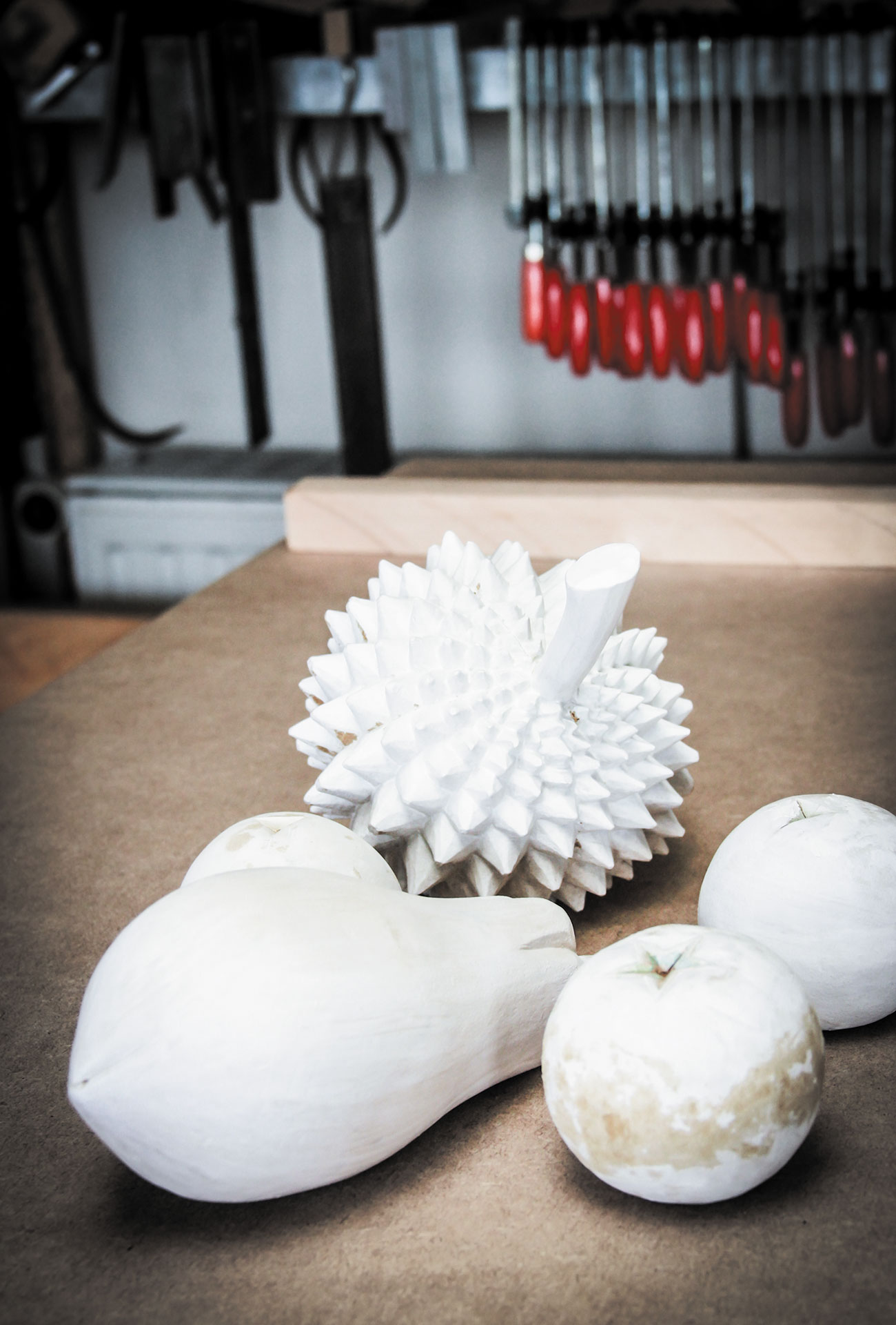 Die Zusammenstellung von Kuriositäten, die ursprünglich nicht zusammengehören, auch in Form von Stilleben, lässt den Sammler nicht los. Es ist eine Hinwendung zum Figurativen – gern im kleineren Format, die für Lungwitz-Kenner neu sein wird. Auf einer Platte arrangierte Holzobjekte bezeugen sein Faible: ein Kaktus, eine Birne, Äpfel, die er weiß bemalt hat. Auch Spielzeug sammelt er, die neueste Anschaffung ist ein altes Puppenhaus. Kehrt man im Alter zur Kindheit zurück? „Ein bisschen, ja. Mein Vater, ein Bildhauer, war selten zuhause. Da gab es kaum Spielzeug.“ Er deutet auf Bücher über seinen Vater, deren Einbände er mitgestaltet hat. „Im Ruhrgebiet gibt es von ihm viele Arbeiten im öffentlichen Raum. Es hat lange gedauert, bis ich mich davon gelöst habe.“ Schnell wechselt er zu seinem gegenwärtigen Schaffen. Er spricht sorgfältig, leidenschaftlich („traumhaft“ ist eines seiner Lieblingsworte) und diese Qualität spürt man auch in seinen Objekten.