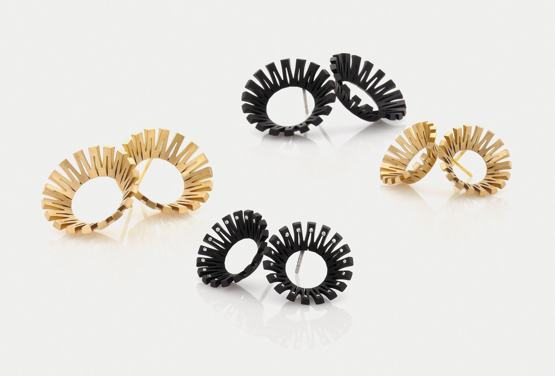 Ohrringe aus der Serie Sunburst. Edelstahl, schwarz, 350 € und 1290 € (mit Brillanten). Gold 750, 1550 € und 2150 €