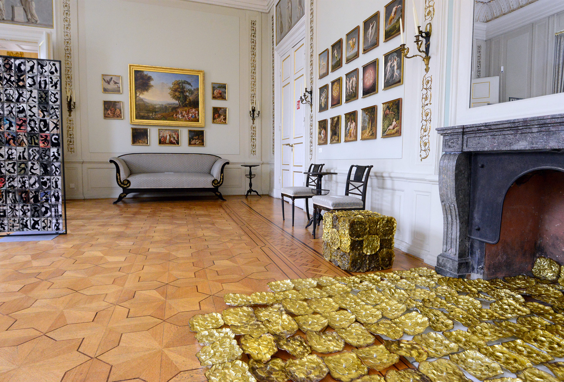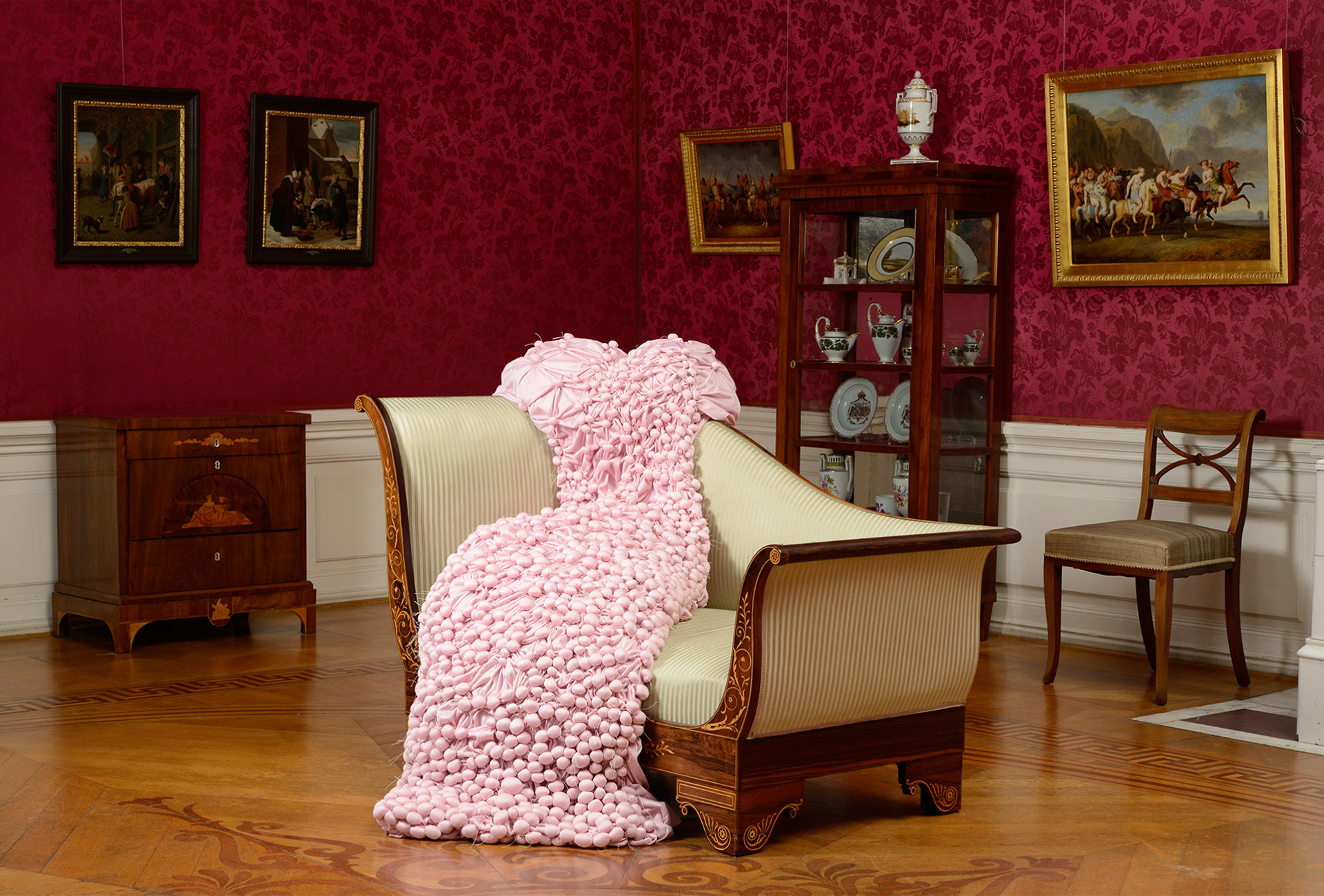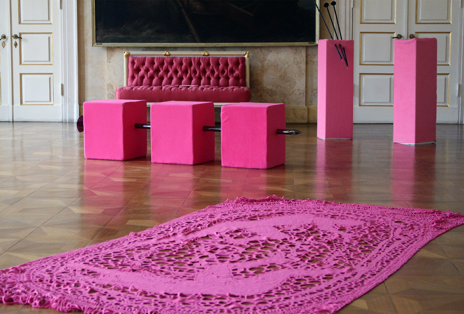 Im Marmorsaal stellt Marianne Herbrich den historischen Sitzmöbeln pinkfarbene Textilhocker zur Seite. Eine Stahlstange verbindet die Würfel und macht sie zur Skulptur, auf der man sitzen darf. Die Farbigkeit des Raums greift Herbrich in ihrer Skulptur Amor und Psyche auf. Im Roten Salon liegt auf der Récamière eine ausgebreitete Robe. Rosa erinnert daran, dass die Schlosssäle einmal bewohnt waren.