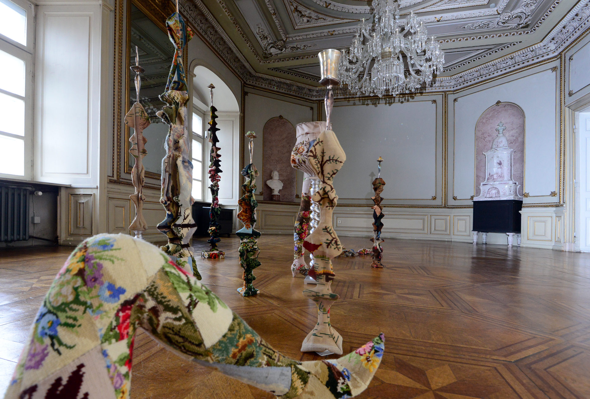 An den Kachelofen des Empfangszimmers hat Susanne Klinke voluminöse Kleidung gehängt. Sie sieht aus als sei sie aus massivem Holz und korrespondiert mit der hölzernen Vertäfelung des Raums. Im Silbersaal greift Klinke Elemente der Tapisserie für ihre Installation auf.